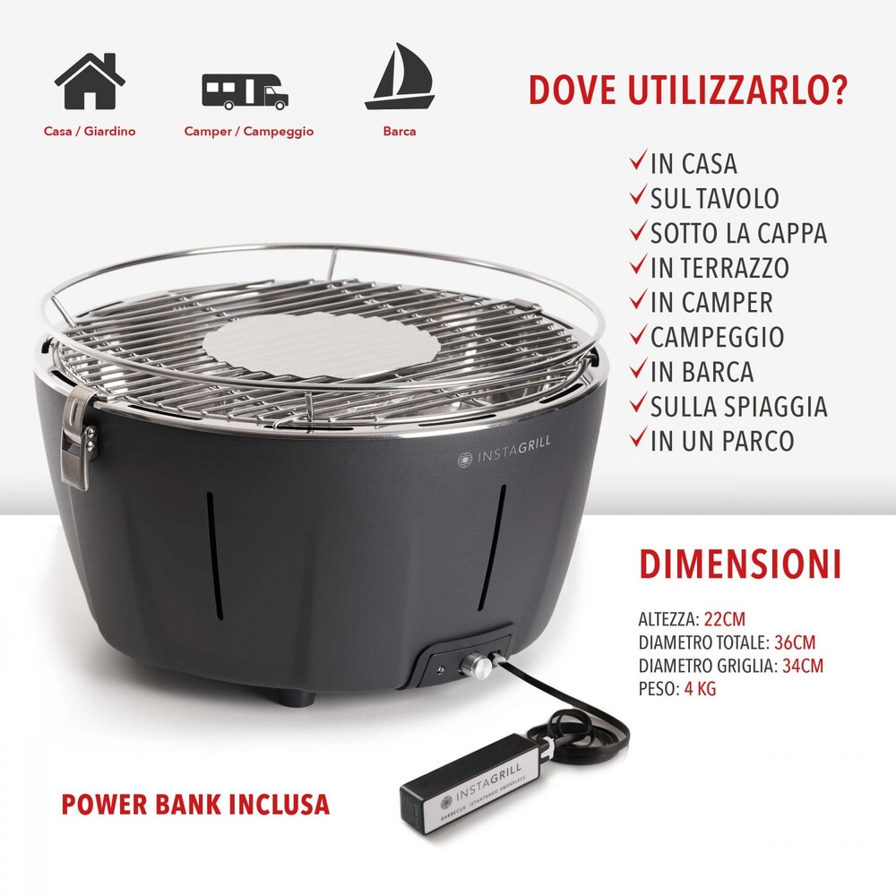 INSTAGRILL è il nuovo Barbecue da tavolo che non fa fumo. Leggero, compatto, portabile e pratico. Utilizzabile sia in casa che in terrazzo o giardino, perfetto per camper o campeggio, può essere portato in vacanza, in barca per una bella grigliata di pesce, all’aperto per un picnic o dovunque vogliate.
