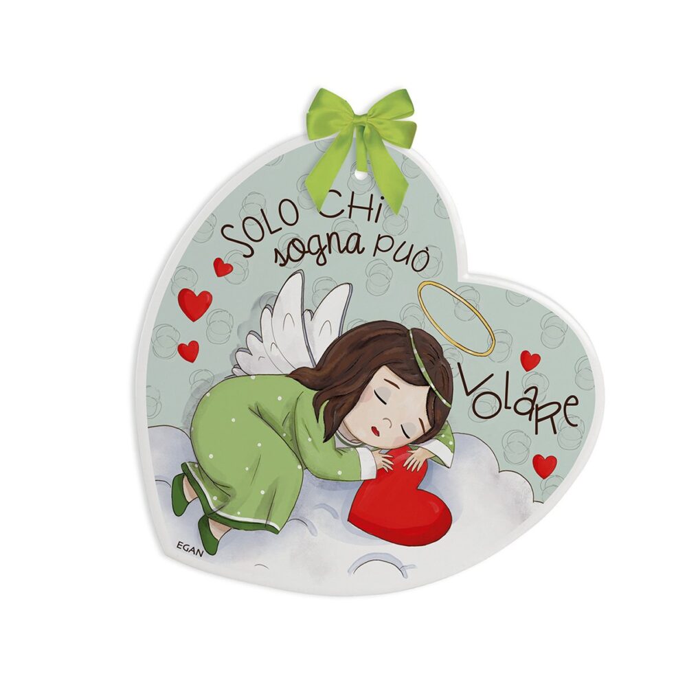 Angelo con decorazione di cuore e ali oro che rendono l’articolo prezioso e simbolico. Un piccolo oggetto che può essere apprezzato per la sua semplicità ed ideale per il giorno della cerimonia dei più piccoli grazie ai colori pastello. Dimensione: h. 20 cm