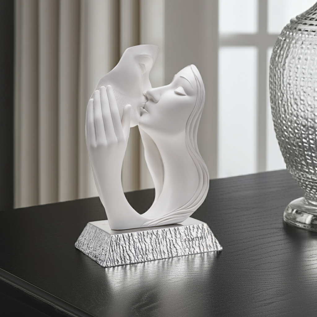 La scultura raffigura due figure stilizzate nell’atto di un bacio, espressione universale di affetto, complicità e legame profondo. La finitura bianca, luminosa e delicata, si sposa perfettamente con la base in argento, creando un contrasto elegante che dona prestigio e raffinatezza all’oggetto. Le dimensioni compatte, 8,2 cm di larghezza e 14 cm di altezza, lo rendono adatto a qualsiasi ambiente: dal soggiorno alla camera da letto, fino a studi e spazi professionali che desiderano trasmettere un messaggio di armonia e positività.