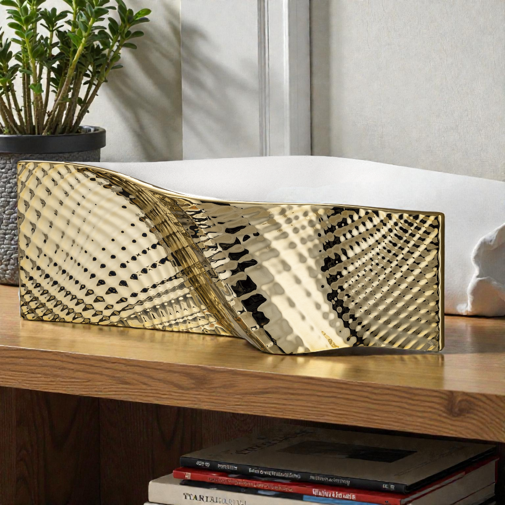 Il centrotavola Ophis 35×18 bianco e oro è un complemento decorativo che unisce semplicità ed eleganza. La superficie chiara riflette la luce con naturalezza, mentre i dettagli dorati donano un tocco raffinato e senza tempo, perfetto per valorizzare ambienti eleganti.