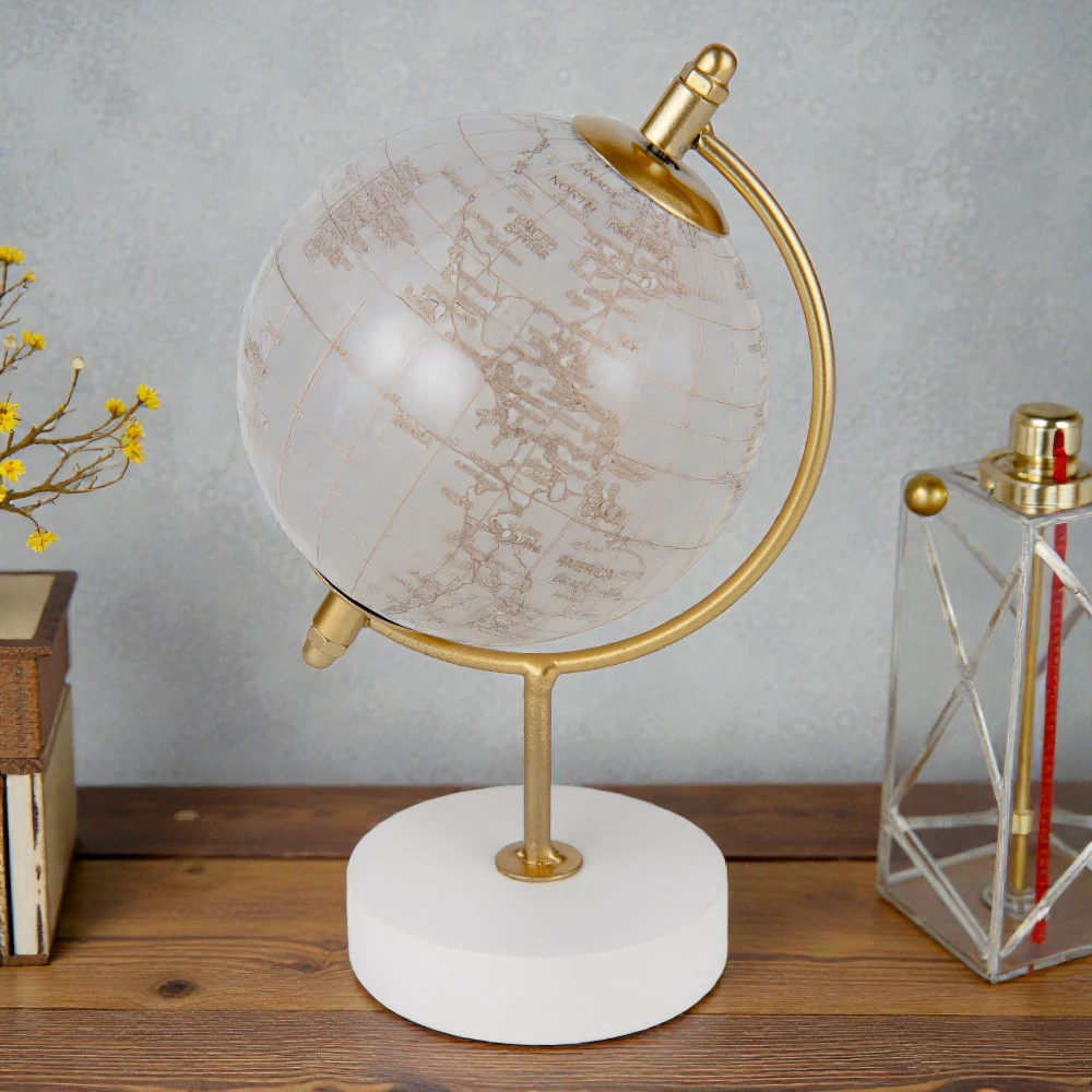 Il mappamondo è sostenuto da una struttura in metallo color oro, solida ed elegante, che crea un piacevole contrasto con la base rotonda bianca. La combinazione di colori neutri e dettagli dorati conferisce all’oggetto un aspetto luminoso e raffinato, facilmente abbinabile a diversi stili di arredamento, dal moderno al classico. La sfera è perfettamente bilanciata e può essere orientata con facilità, unendo estetica e funzionalità.