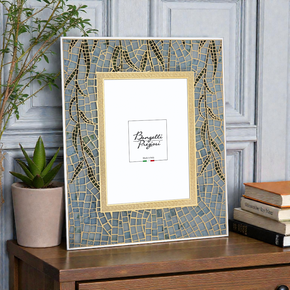 Il portafoto in vetro mosaico Bongelli Preziosi modello in vetro mosaico è un complemento d’arredo raffinato, pensato per valorizzare i ricordi più importanti con stile ed equilibrio estetico. La superficie in vetro decorato a mosaico crea un gioco di riflessi luminosi che dona profondità e carattere all’oggetto, rendendolo ideale sia per ambienti classici sia per spazi moderni. Ogni dettaglio è studiato per offrire un prodotto decorativo capace di distinguersi senza risultare eccessivo.