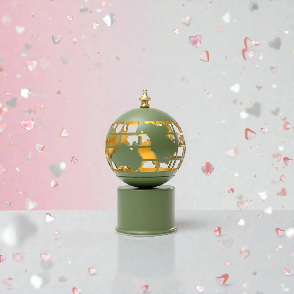 La lampada è caratterizzata da una struttura a sfera con intagli che richiamano la mappa del mondo, lasciando filtrare la luce in modo suggestivo. I dettagli dorati a contrasto con il verde creano un effetto elegante e raffinato, mentre la base cilindrica assicura stabilità e continuità stilistica. La lavorazione curata nei dettagli rende questa lampada un vero oggetto di design.