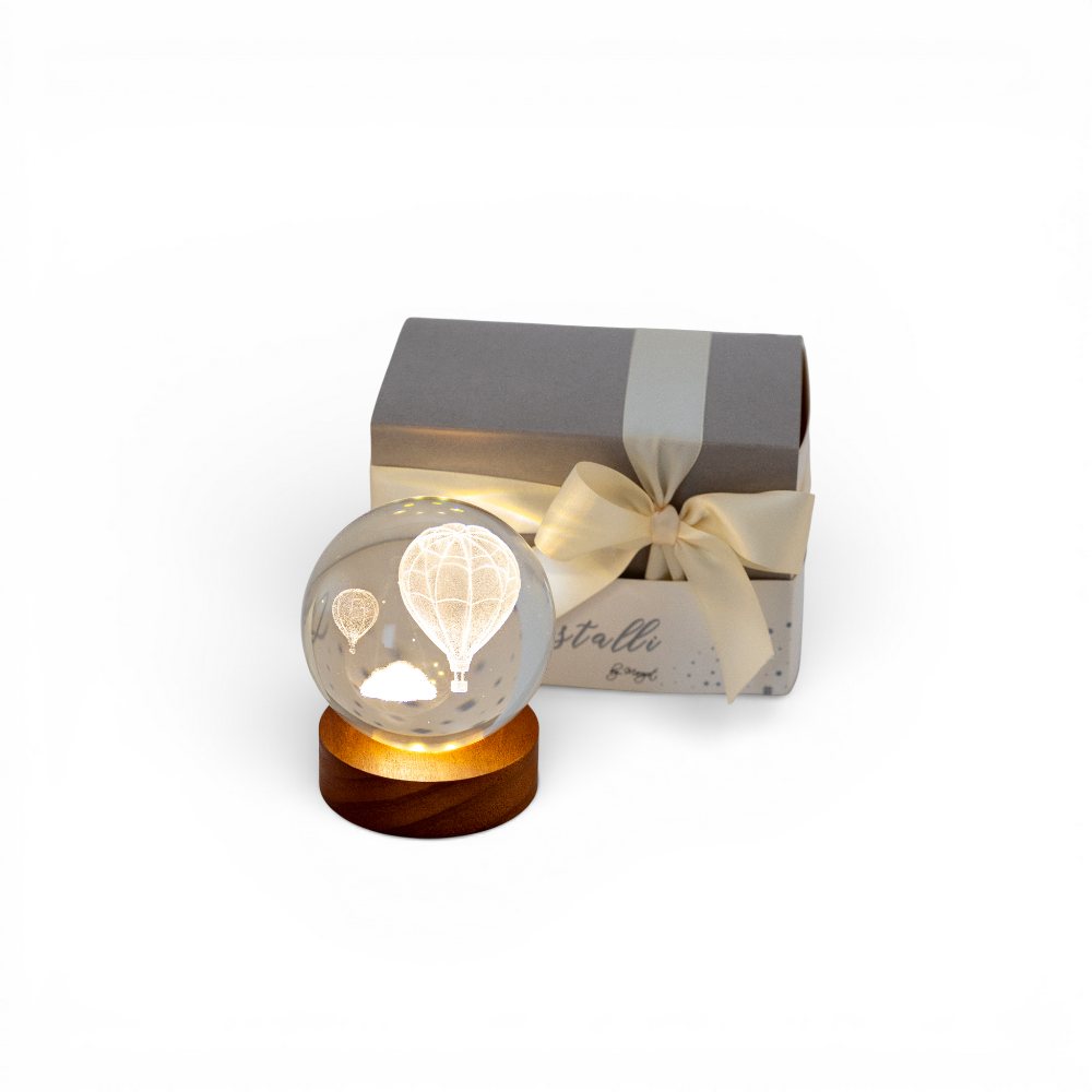 La base ospita un potente LED che, quando acceso, irradia la luce verso l’alto. La mongolfiera sembra così “prendere il volo” in una nuvola di luce, creando un’atmosfera magica e rilassante, perfetta come luce notturna o decorativa.