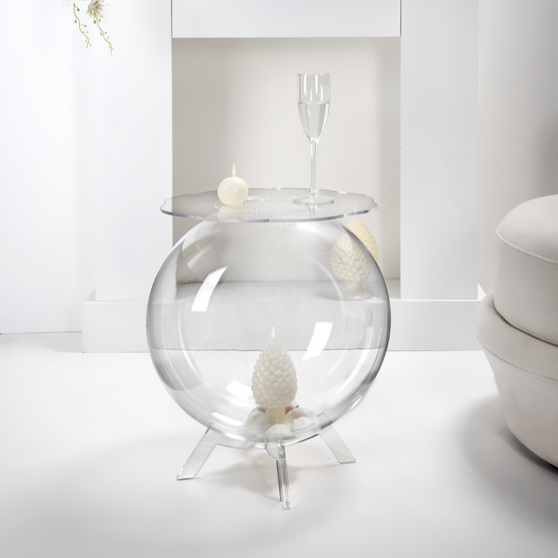 Porta un tocco di design innovativo e funzionale nel tuo spazio con il nostro tavolino moderno trasparente a forma di sfera, realizzato in plexiglass di alta qualità. Boollino è unico e si distingue per la sua struttura sferica, che non solo cattura l’attenzione, ma offre anche una superficie d’appoggio pratica grazie al tappo superiore rimovibile. Ideale per ambienti moderni e minimalisti, il suo design versatile lo rende perfetto come tavolino da salotto, accanto al divano o come originale elemento d’arredo in camera da letto.