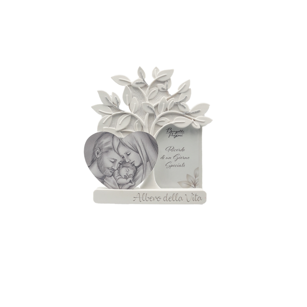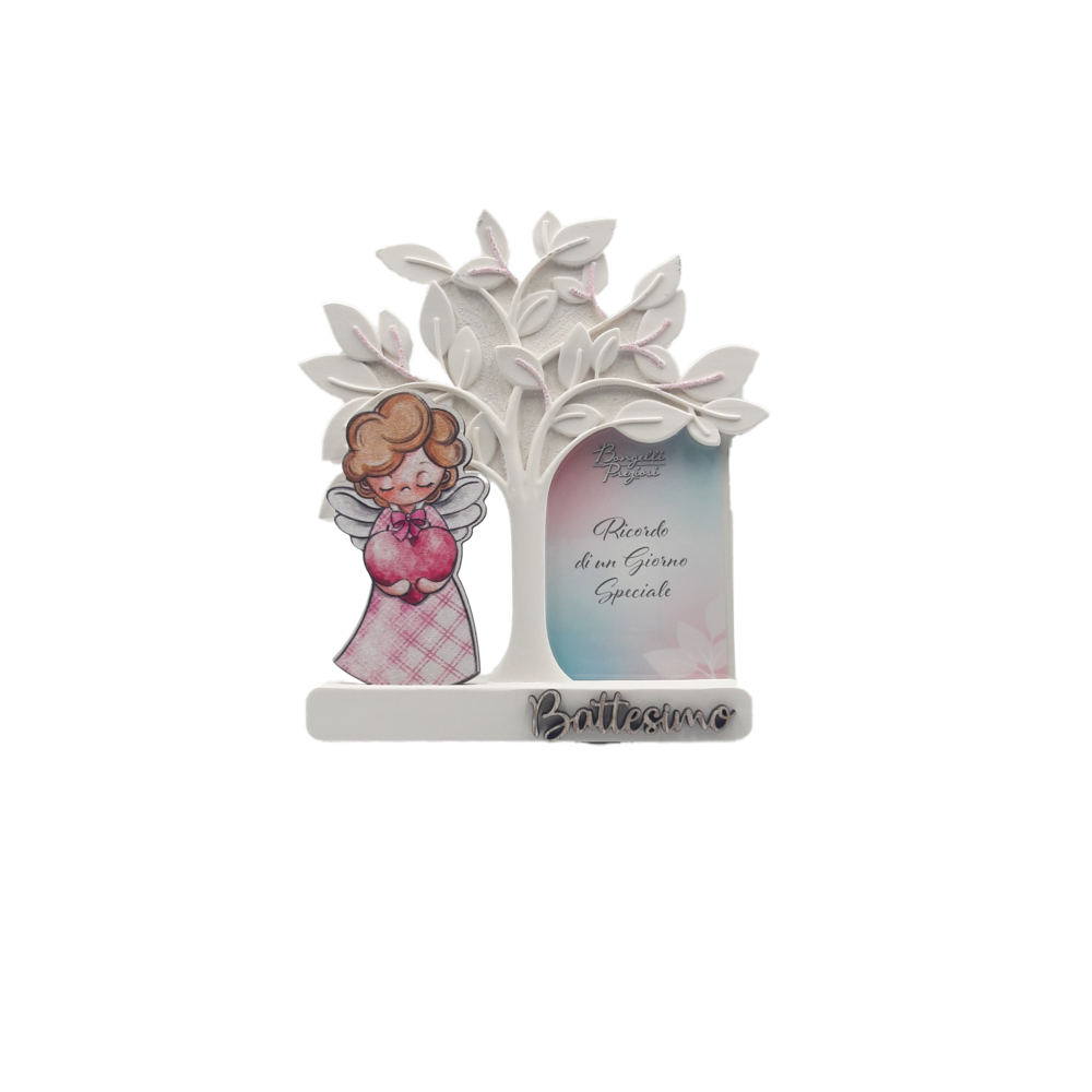 L’albero portafoto è una semplice ma elegante idea regalo grazie al colori tenui che lo contraddistinguono, oltre ai dettagli con brillantini che donano luce. Nella versione Battesimo, la delicatezza di questo articolo ricorda la dolcezza del sacramento. Dimensione: 16×14 cm