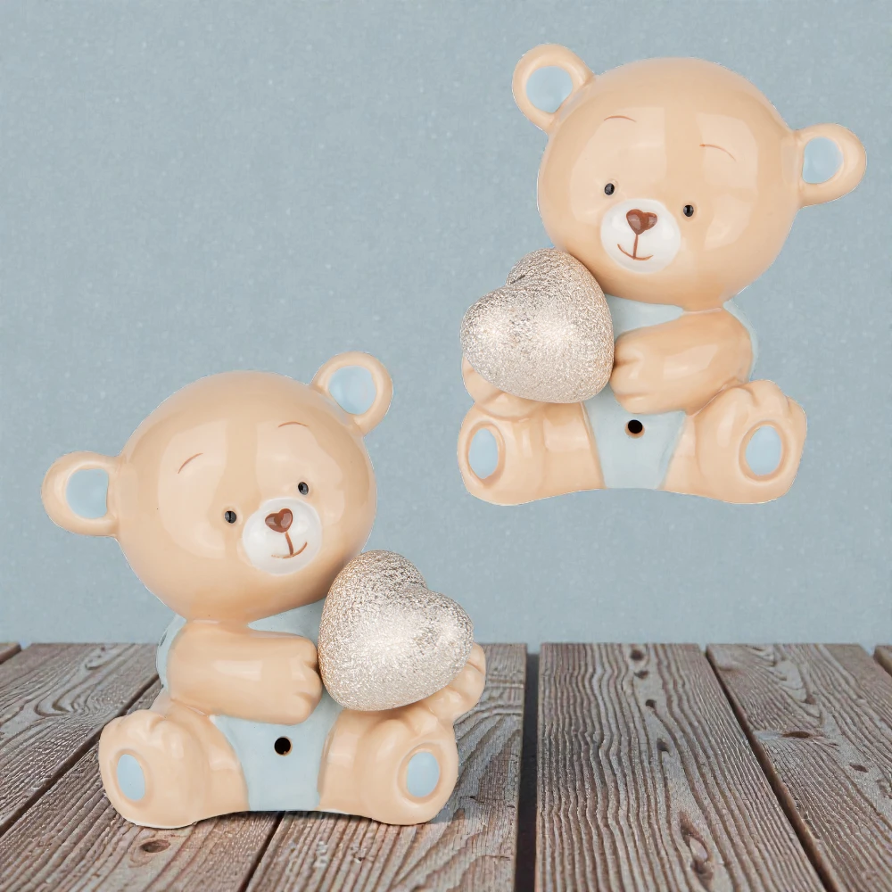Orsetto decorativo in ceramica con cuore argentato glitter e colori pastello, ideale come bomboniera o tenera idea regalo per occasioni speciali.