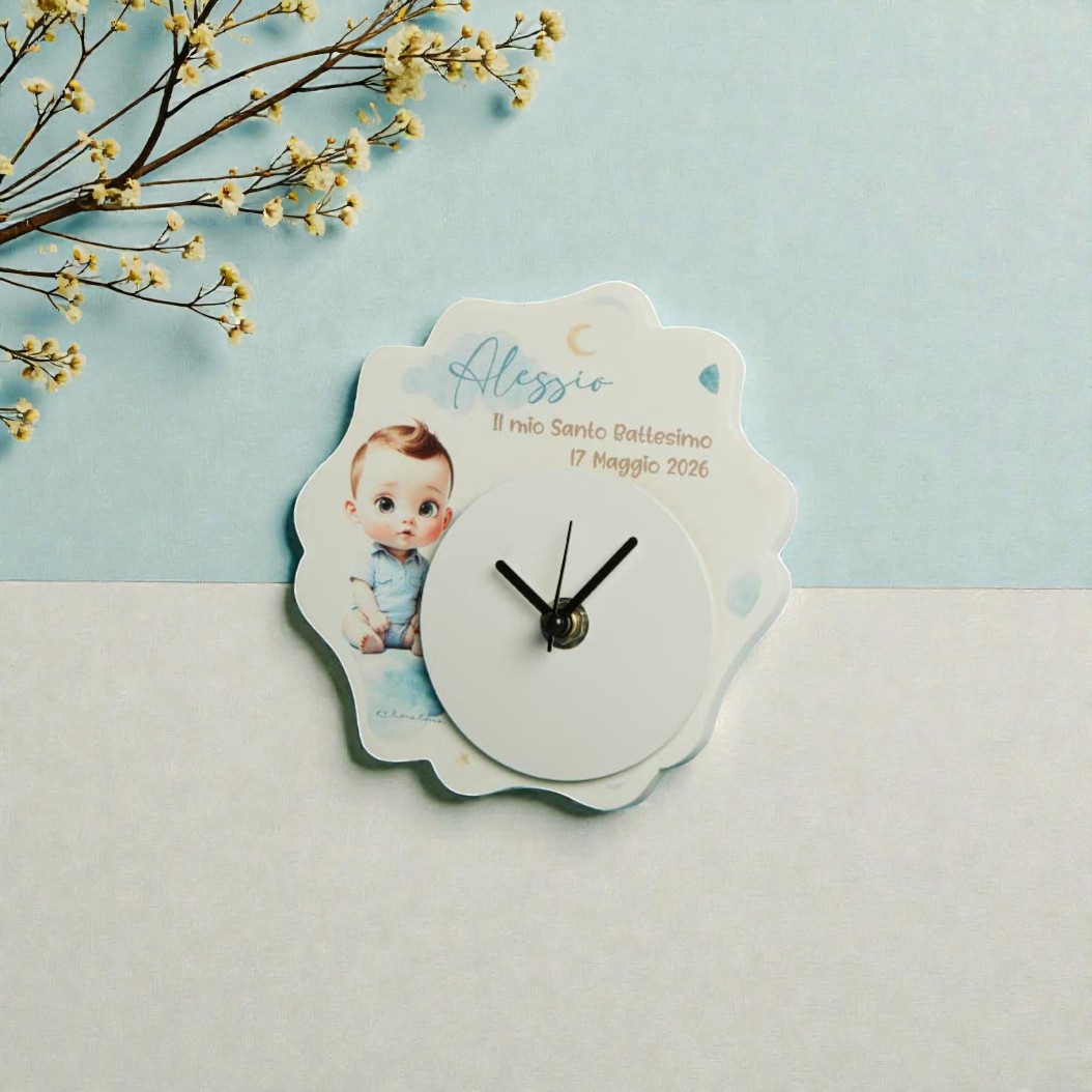 Questo orologio si distingue per la sua forma armoniosa e per il bordo a nuvoletta che conferisce dolcezza e movimento. Le sfumature colorate chiare aggiungono luminosità e un tocco di modernità, rendendo la bomboniera un complemento d’arredo versatile e capace di adattarsi a qualsiasi ambiente, dal classico al contemporaneo.
