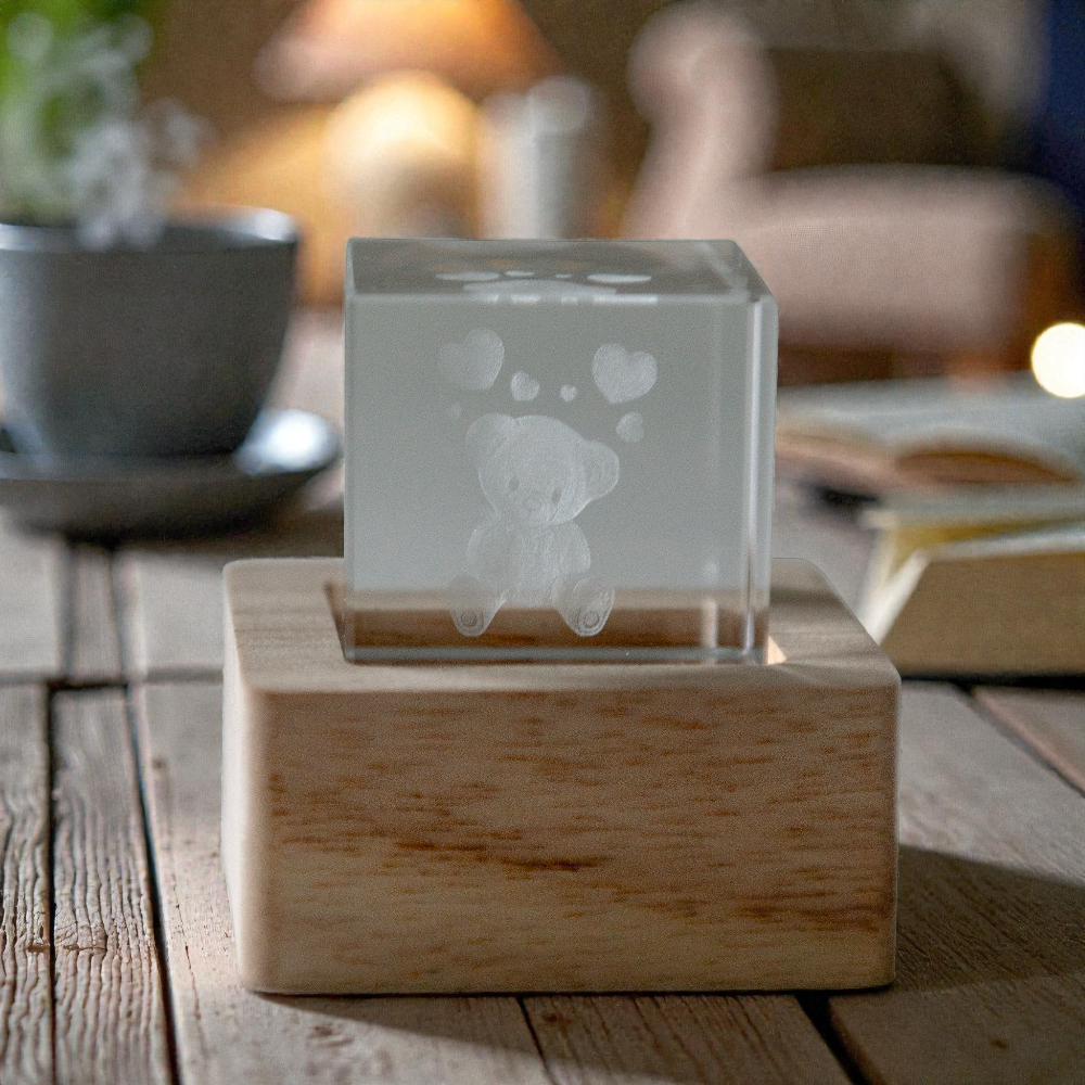 Il cubo in vetro trasparente è valorizzato da una base in legno naturale, che crea un piacevole contrasto tra la trasparenza del vetro e il calore del materiale ligneo. L’incisione interna dell’orsetto e dei piccoli cuori dona profondità e raffinatezza all’oggetto, senza appesantirne lo stile. Le linee pulite e moderne permettono di inserirlo facilmente in qualsiasi ambiente, dalla cameretta al soggiorno.