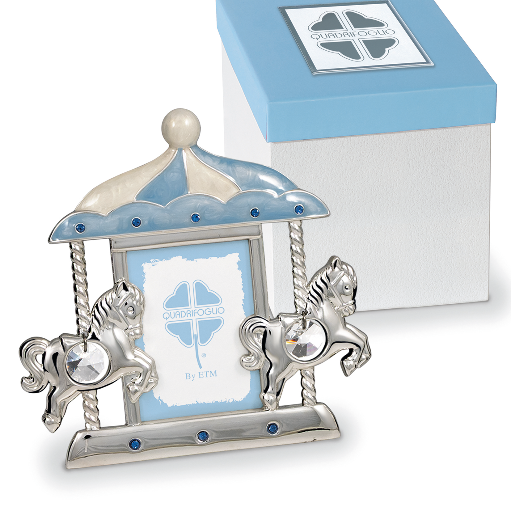 Portafoto con cavallini in argento e inserti celesti – Bomboniere solidali Quadrifoglio