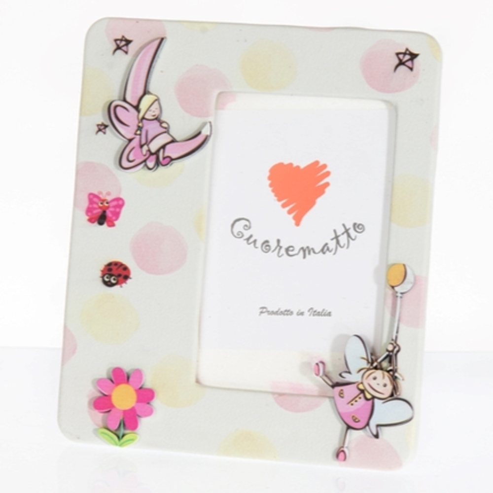 Portafoto in ecopelle e legno con disegni di angeli rosa. La collezione Cuor amico si caratterizza per le decorazioni con disegni adatti per i ragazzi e bambini. Dimensione: int 9×13 – 17×20 cm
