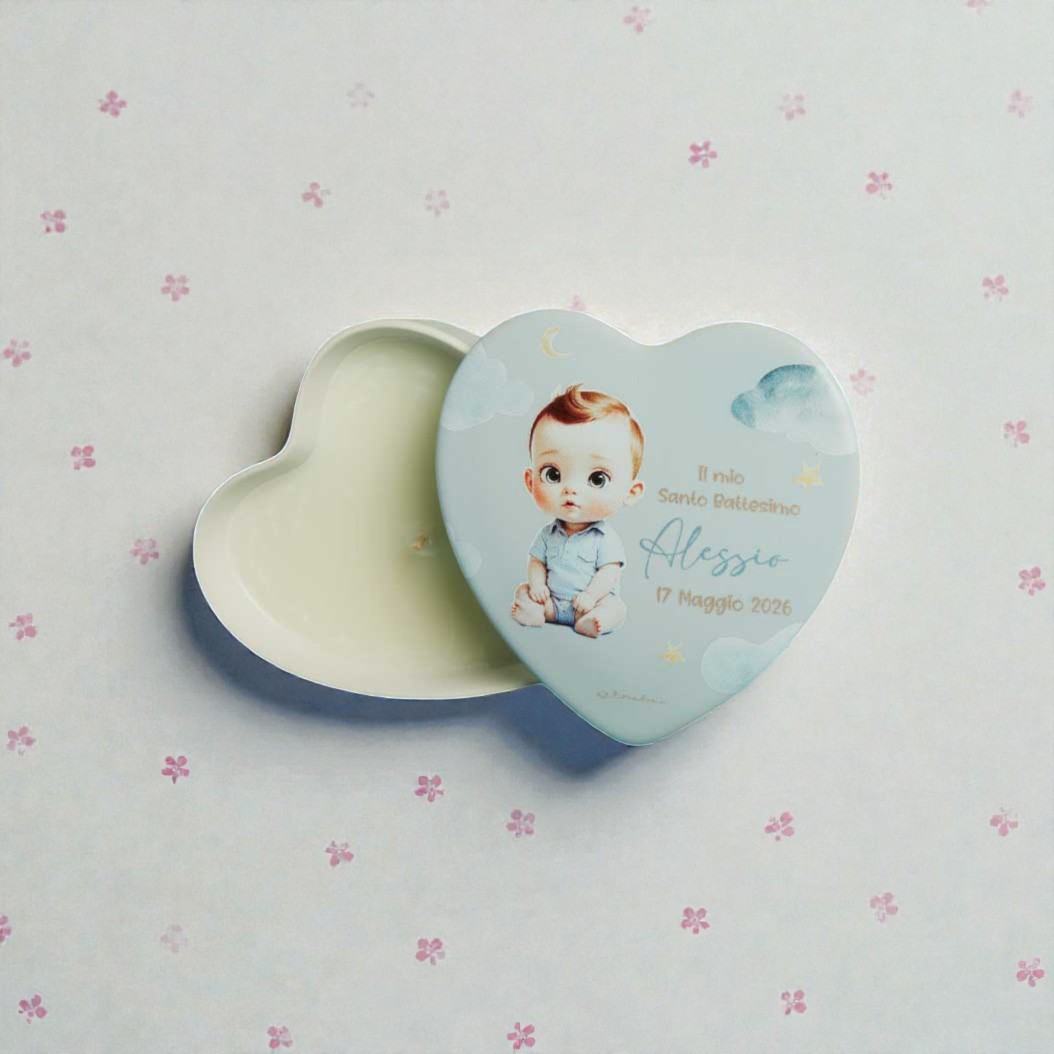 La scatolina candela cuore si distingue per la sua forma armoniosa e per il coperchio impreziosito dal disegno di un simpatico bimbo. Le sfumature colorate chiare aggiungono luminosità e dolcezza, trasformando questa bomboniera in un complemento d’arredo versatile e sofisticato. Un dettaglio che unisce arte e romanticismo, rendendo ogni evento ancora più speciale. All’interno della scatolina candela cuore è presente una candela, pronta per essere accesa e diffondere una luce calda e avvolgente. Inoltre, la scatolina candela cuore si può personalizzare con il nome del festeggiato. Questo elemento rende la bomboniera ancora più significativa, trasformandola in un simbolo di intimità e serenità. Un gesto semplice che porta armonia e dolcezza negli spazi domestici, regalando emozioni autentiche. Dimensioni: 12x12x4,5 cm