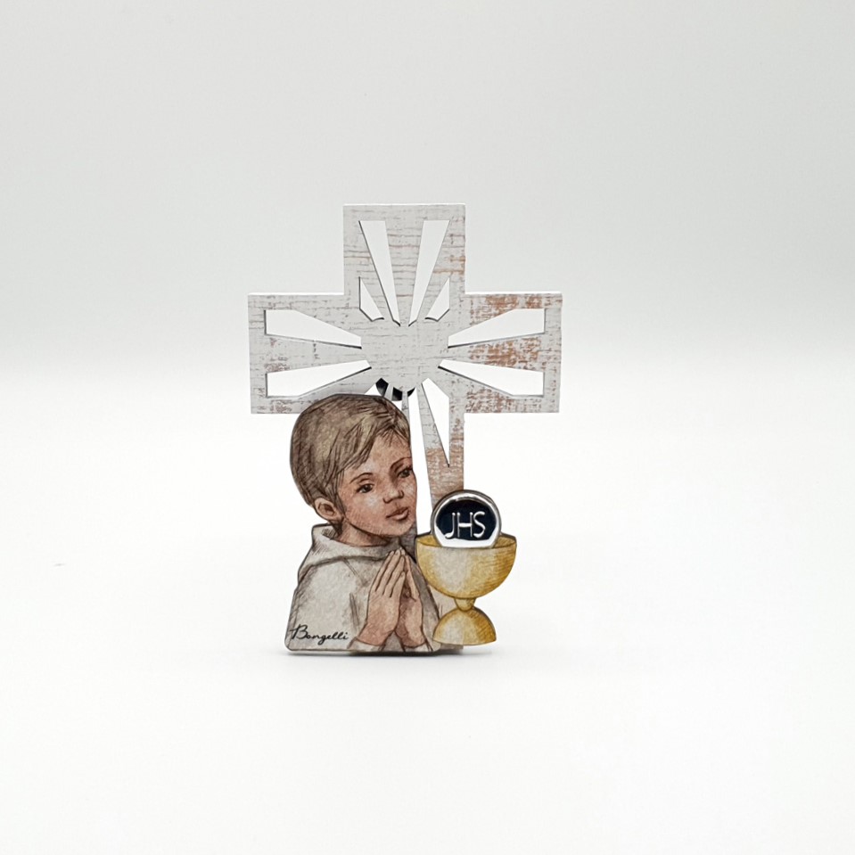 Croce Comunione in legno shabby con icona della Prima Comunione per lui. Dimensione: 10×15 cm