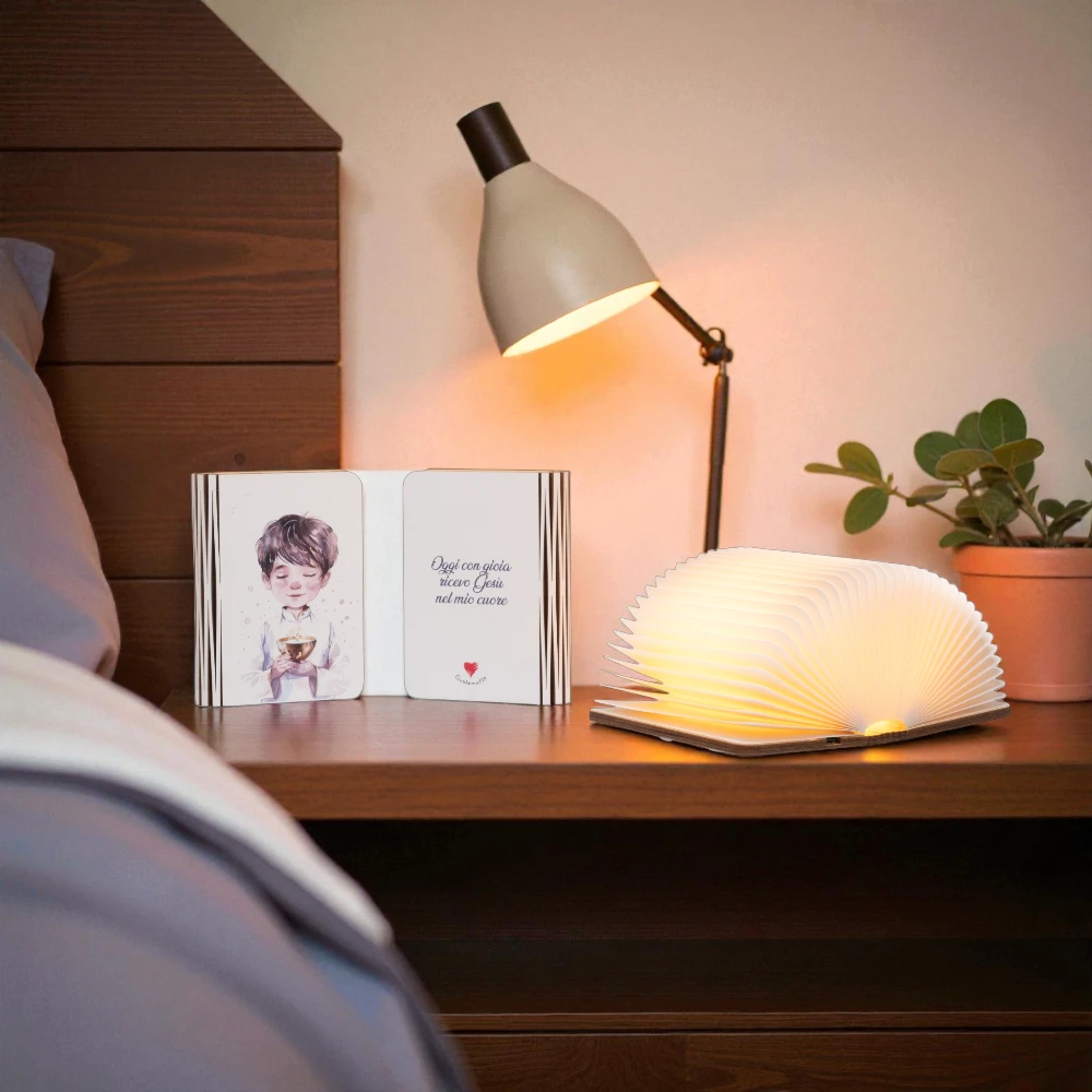 Il Libro Luminoso Comunione Maschio è un dono simbolico pensato per celebrare un momento importante come la Prima Comunione. La sua linea elegante e il formato compatto lo rendono un oggetto prezioso da conservare nel tempo. Il design ricorda un piccolo volume sacro, interpretato in chiave moderna grazie alla presenza di una delicata illuminazione interna.