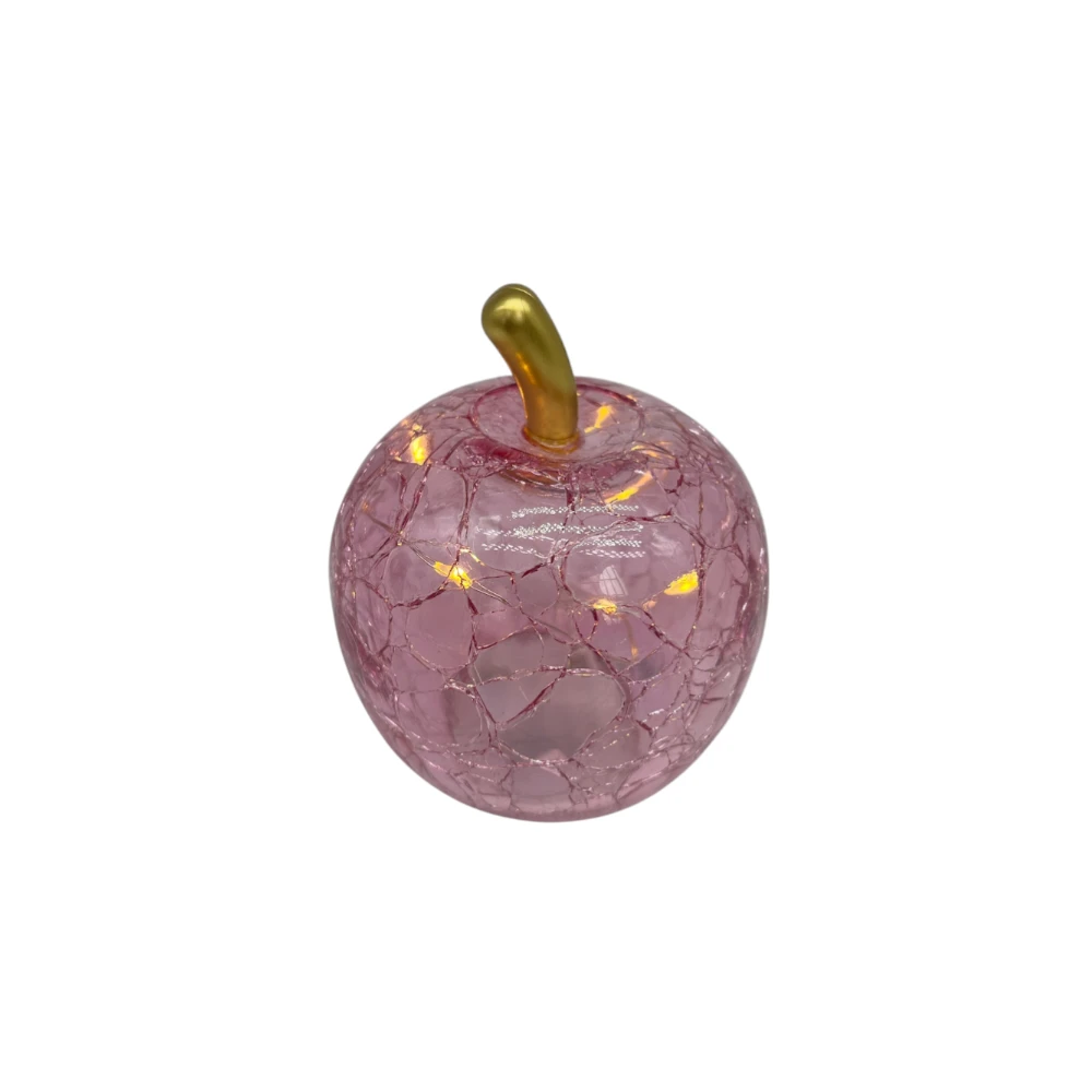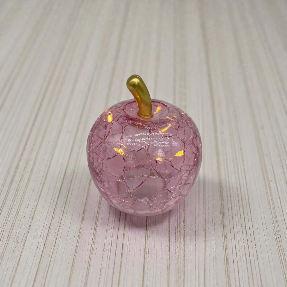 Il vetro craquelè trasparente con delicate sfumature rosa dona profondità e carattere alla struttura, mentre le micro luci LED interne esaltano la texture del vetro creando riflessi eleganti. Il gambo superiore dorato aggiunge un contrasto luminoso e ricercato, trasformando la mela LED in un vero elemento di design, adatto sia ad ambienti moderni che classici.