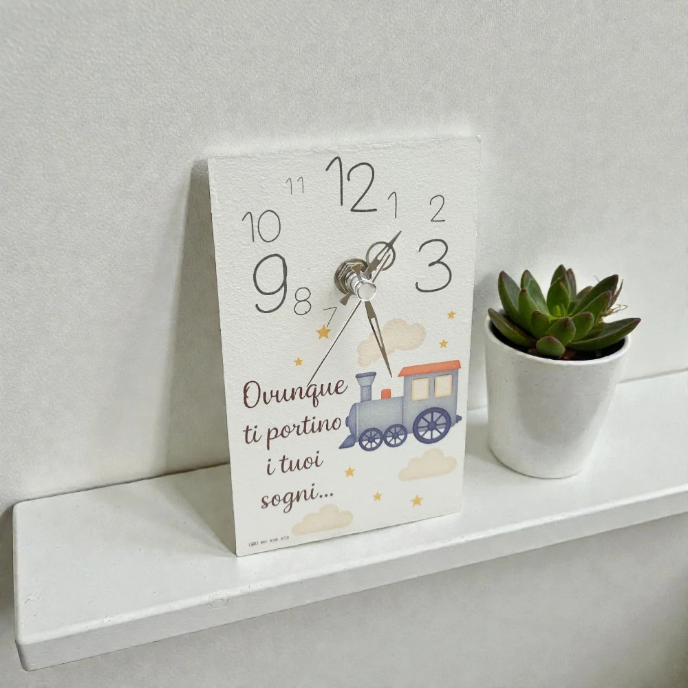L’orologio con trenino e scritta ispirazionale è una splendida idea regalo per nascite, compleanni o occasioni speciali. Un oggetto che non si limita a segnare il tempo, ma invita a credere nei propri sogni e ad affrontare ogni giornata con entusiasmo.
