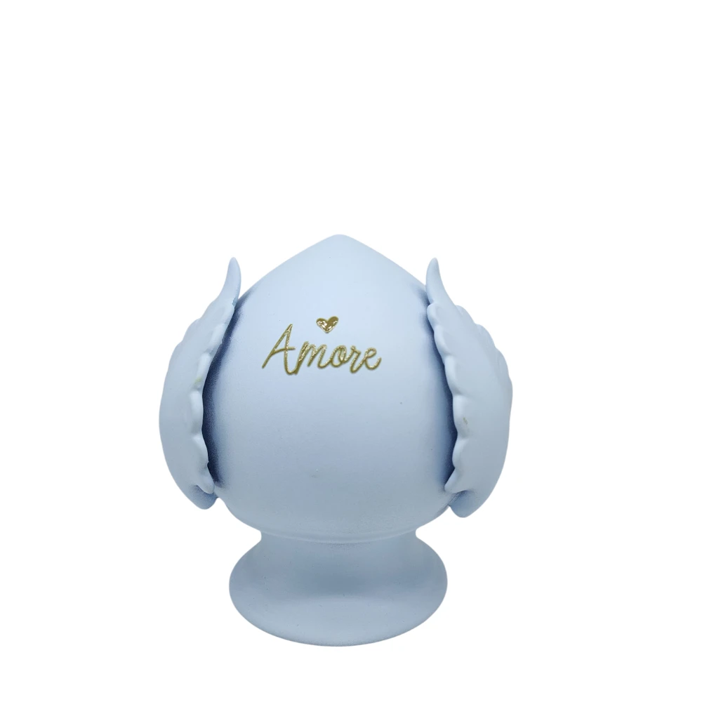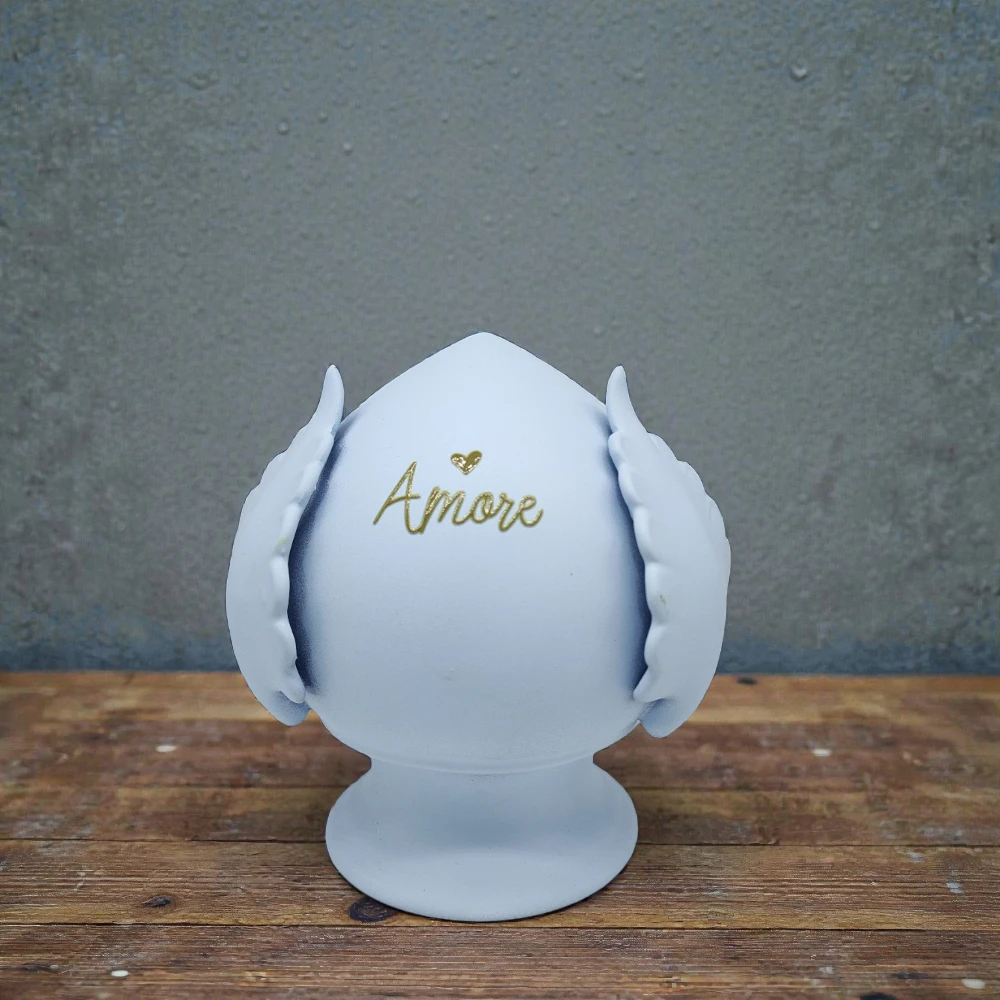Il design essenziale e armonioso è arricchito da delicate ali stilizzate laterali, che conferiscono leggerezza e unicità alla forma. La scritta dorata a contrasto dona luminosità e rende la pigna un elemento decorativo elegante, adatto sia ad ambienti classici che moderni. Grazie alle sue dimensioni contenute, può essere facilmente posizionata su mensole, credenze, scrivanie o tavolini.