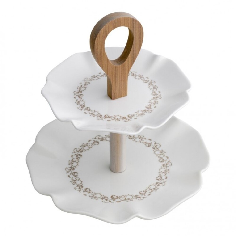 La nuova alzata “Riccioli di fata” è un piacevole connubio tra l’eleganza della porcellana di cui si compone e l’energia del bambù che le fa da supporto. Composta da due capienti ripiani, dai peculiari bordi frastagliati e i delicati decori floreali color tortora con sorprendenti punte di dorato. Dimensione: diam. 20 cmx21 h. Scopri tutte le collezioni Brandani Group qui.