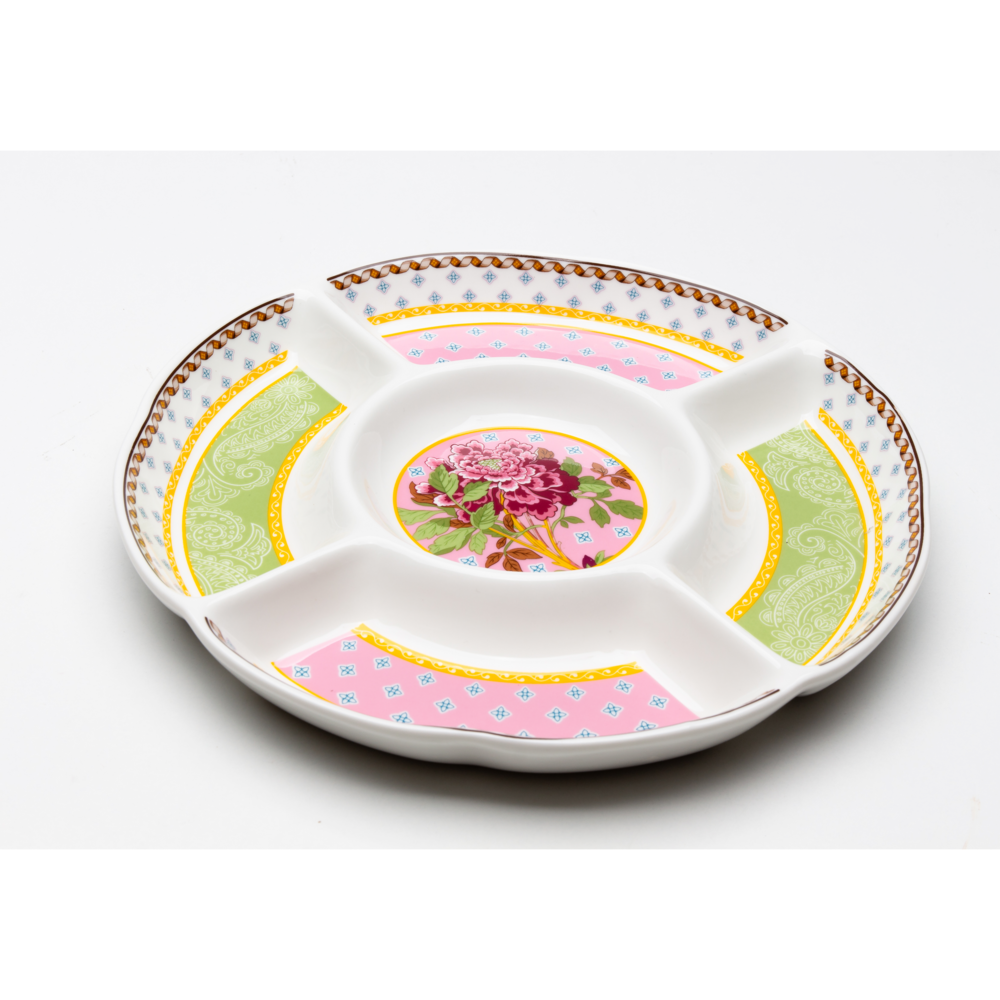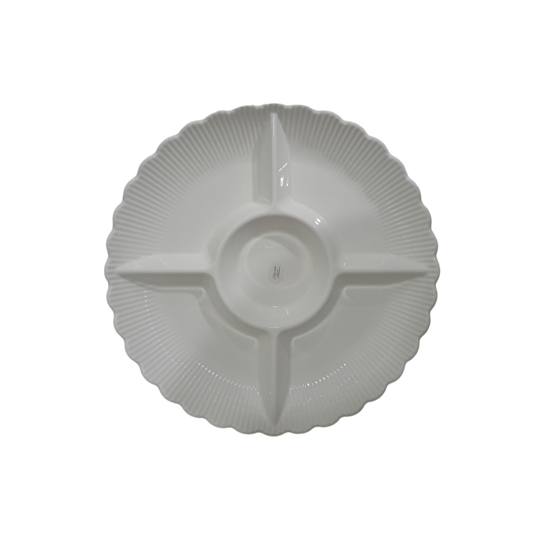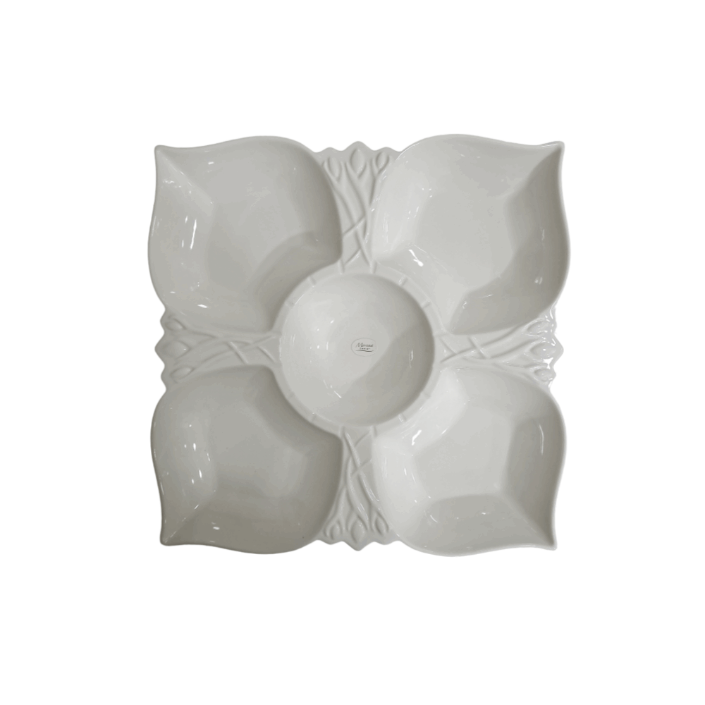 Antipastiera quadra in ceramica di colore bianco e decorazioni in rilievo che donano eleganza all’articolo. La porcellana che non passa mai di moda, diventa un oggetto perfetto da regalare agli ospiti. Dimensione: 29×29 cm