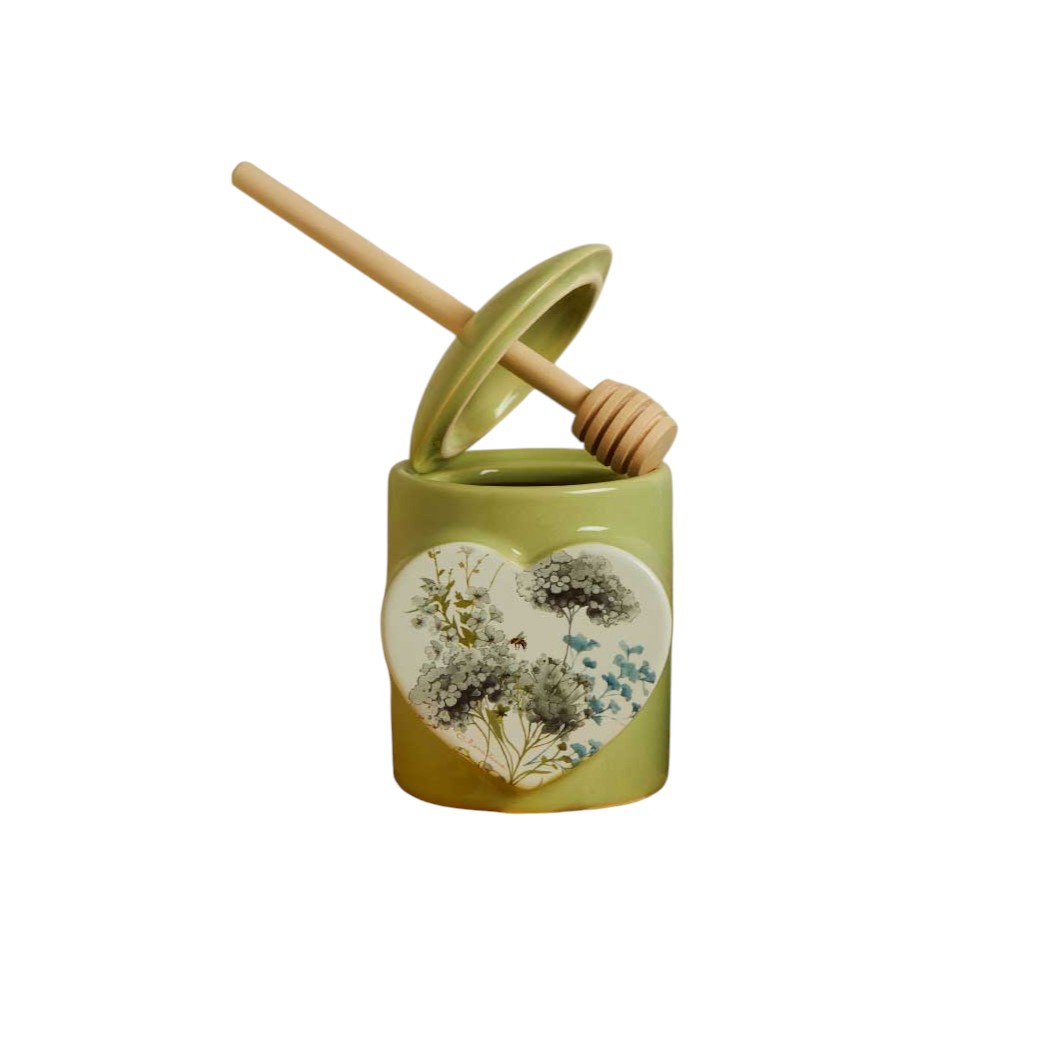 Realizzato in ceramica di alta qualità, il barattolo porta miele si distingue per la decorazione floreale sul fronte, dai colori tenui e armoniosi. Il coperchio abbinato e lo spargi miele in legno completano il set, aggiungendo un tocco rustico ed elegante, ideale per eventi dal gusto naturale e romantico.