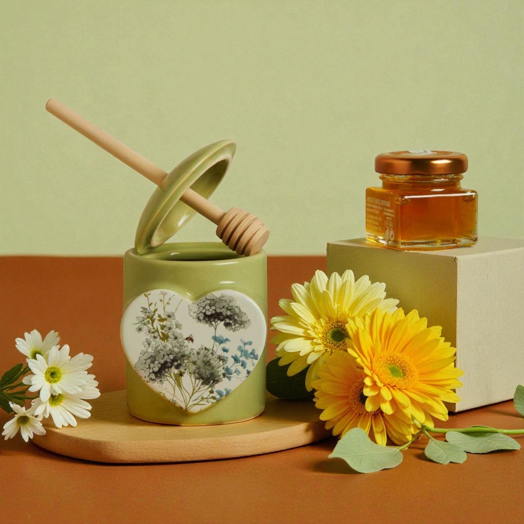 Realizzato in ceramica di alta qualità, il barattolo porta miele si distingue per la decorazione floreale sul fronte, dai colori tenui e armoniosi. Il coperchio abbinato e lo spargi miele in legno completano il set, aggiungendo un tocco rustico ed elegante, ideale per eventi dal gusto naturale e romantico. Nella confezione è incluso anche un barattolo con miele da donare agli ospiti e rendere questa bomboniera completa e apprezzabile. Il barattolo porta miele è perfetto per contenere miele artigianale e può essere utilizzato quotidianamente in cucina o esposto come complemento d’arredo. Un ricordo utile e duraturo che gli ospiti potranno conservare con piacere, trasformando la bomboniera in un gesto di affetto e attenzione Dimensione: 6,5×7,5×9 cm
