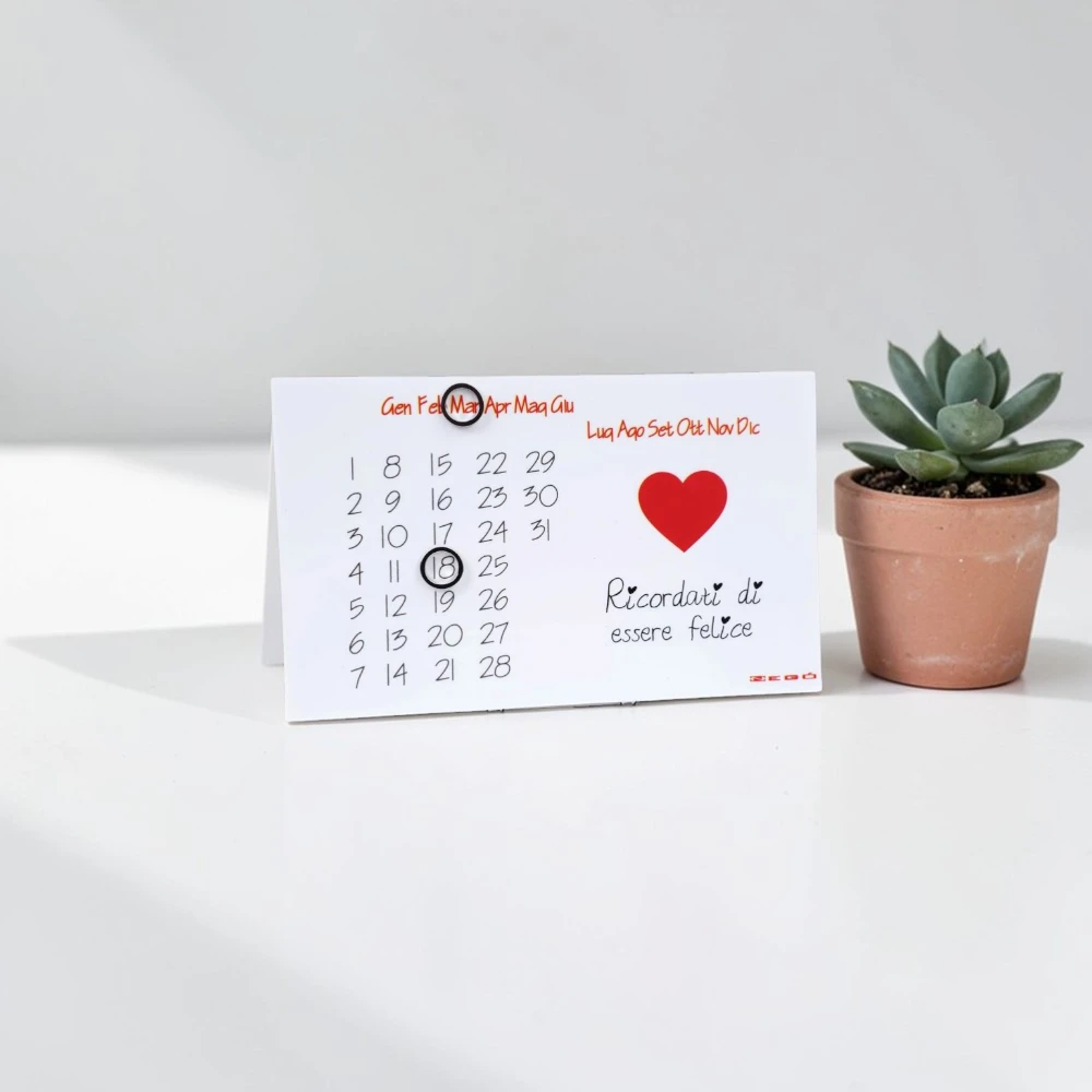 Questo calendario con cuore è anche un’ottima idea regalo per compleanni, anniversari, San Valentino o altre occasioni speciali. Il suo messaggio motivazionale lo rende un dono simbolico, capace di trasmettere affetto e buonumore ogni giorno dell’anno. Perfetto per un e-commerce che propone articoli regalo, complementi d’arredo moderni e oggetti dal forte impatto emozionale.
