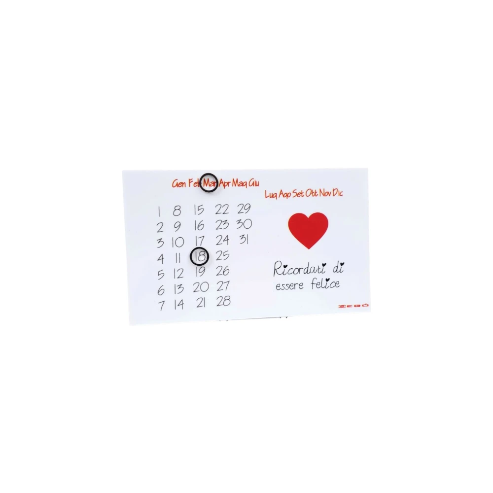 Questo calendario perpetuo dal design minimal è un complemento d’arredo elegante e significativo, perfetto per chi ama circondarsi di oggetti dal valore emozionale. Il cuore rosso, simbolo universale di amore e positività, si abbina alla frase motivazionale “Ricordati di essere felice”, trasformando un semplice calendario in un vero e proprio messaggio quotidiano di ispirazione. Lo stile pulito, con fondo chiaro e dettagli grafici ben definiti, lo rende adatto a qualsiasi ambiente domestico o professionale.