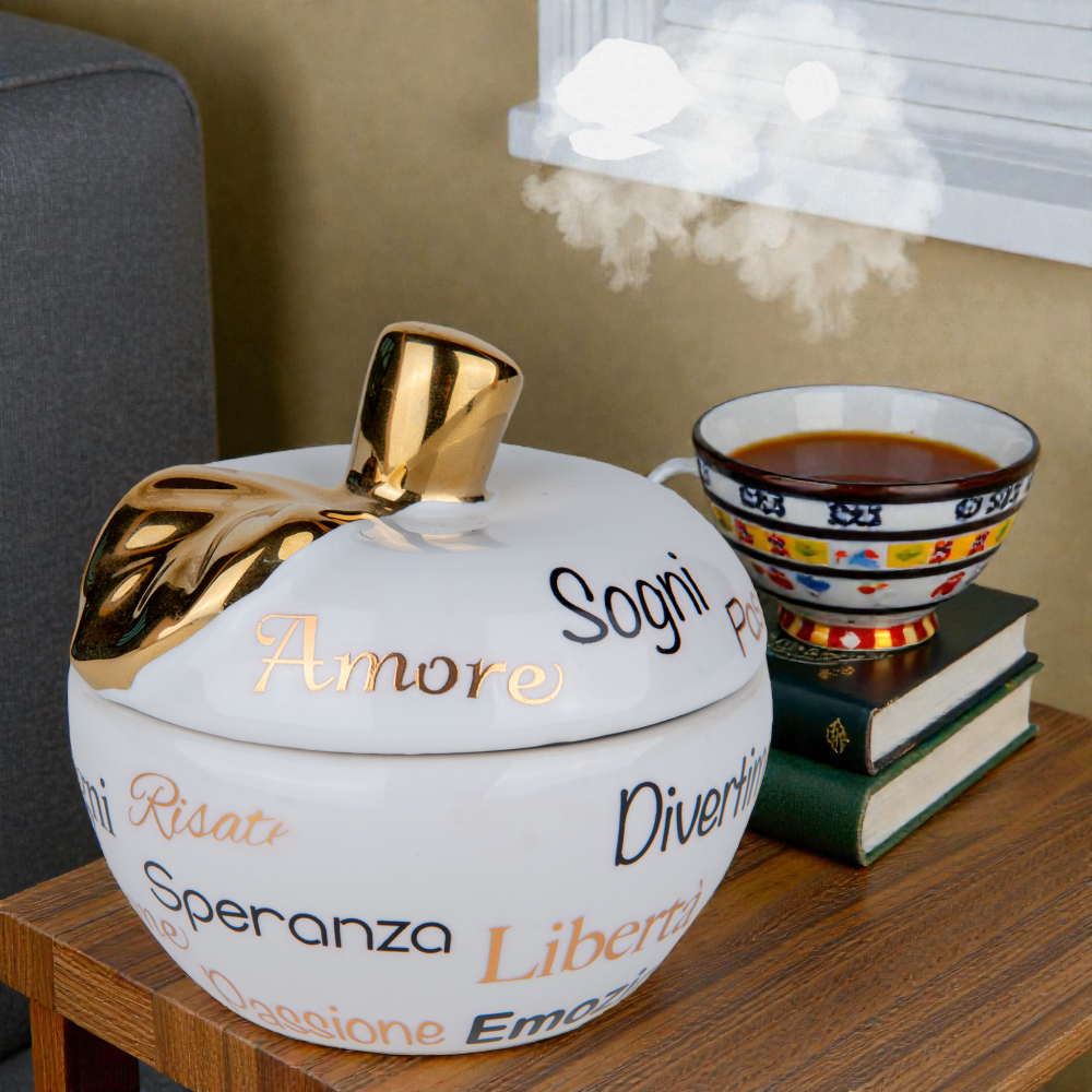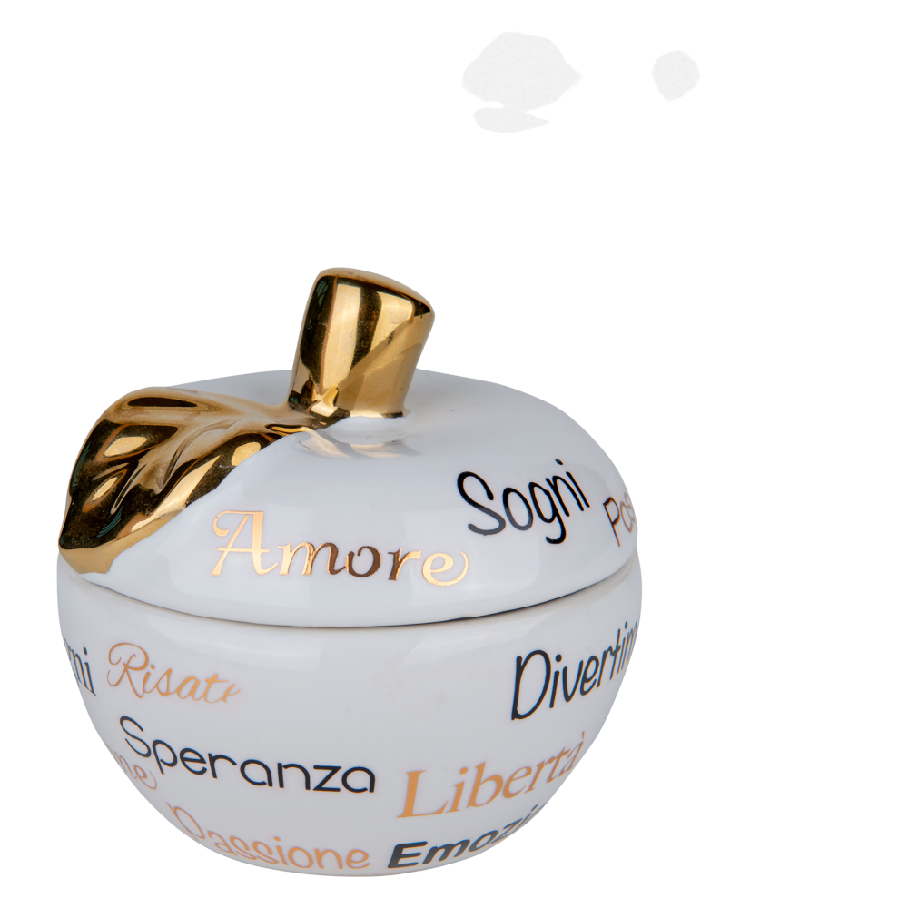 Il design si distingue per la ceramica bianca smaltata, luminosa e delicata, impreziosita da scritte in tonalità nere e dorate che creano un piacevole contrasto visivo. Il picciolo e la foglia dorati, lucidi e raffinati, aggiungono un tocco di pregio che rende questa candela ideale anche per ambienti eleganti e moderni. La forma compatta e armoniosa la rende perfetta da esporre su tavolini, mensole, comodini o centrotavola.
