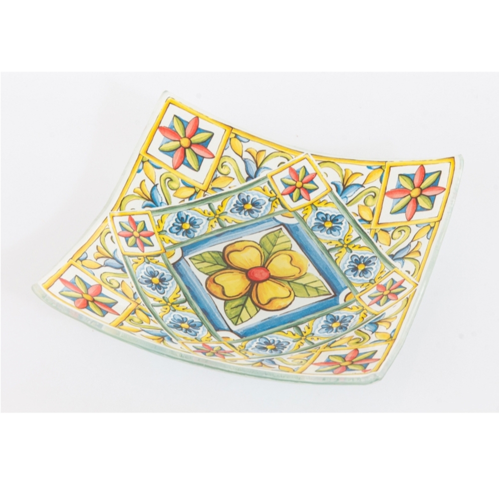 Ciotolina realizzato in vetro caratterizzata da decorazioni dai toni caldi che ricordano il Mediterraneo, la sua cultura e la sua arte, ispirazione per tutta la nuova collezione 2022. Dimensione: 14×14 cm