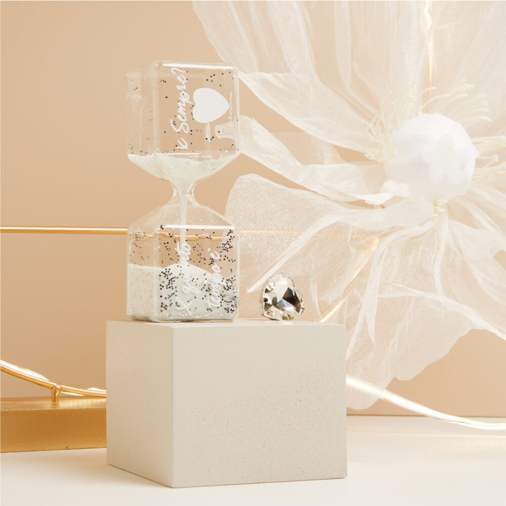 La clessidra è un simbolo di amore eterno. Perfetta per essere esposta in casa, è un piacere che unisce. La bellezza della clessidra trasparente, combinata con la frase romantica, trasmette emozioni profonde, rendendo ogni ambiente più accogliente e romantico. Un regalo che parla di eleganza e raffinatezza, ideale per ogni evento speciale.