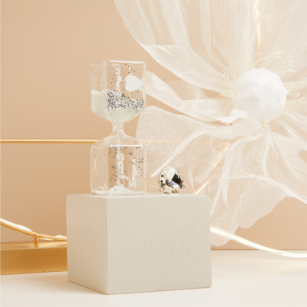 La clessidra è una bomboniera perfetta. Questa elegante clessidra trasparente è adornata con una frase romantica, scritta delicatamente sulla sua superficie. La polverina bianca all’interno scorre con grazia, creando un effetto visivo incantevole. Inoltre, tutta la bomboniera è impreziosita da piccoli brillantini, che aggiungono un tocco di magia e scintillio.