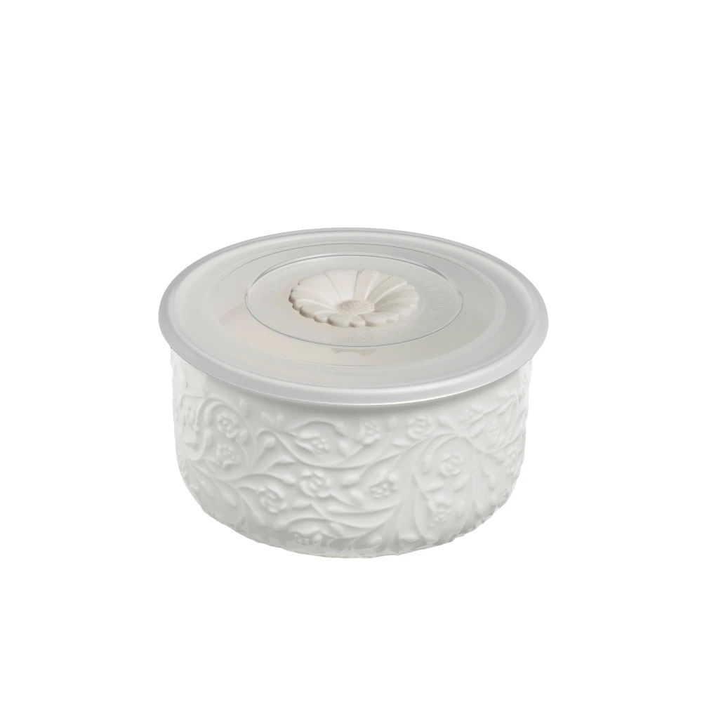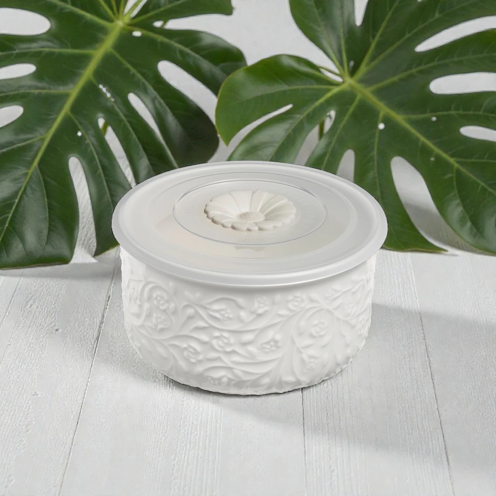 Contenitore in porcellana bianca con decori floreali in rilievo, elegante e versatile, perfetto per casa o come idea regalo.