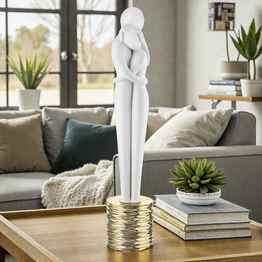 Scultura decorativa raffigurante una coppia stilizzata slanciata con finitura oro. Elegante e simbolica, ideale come bomboniera.