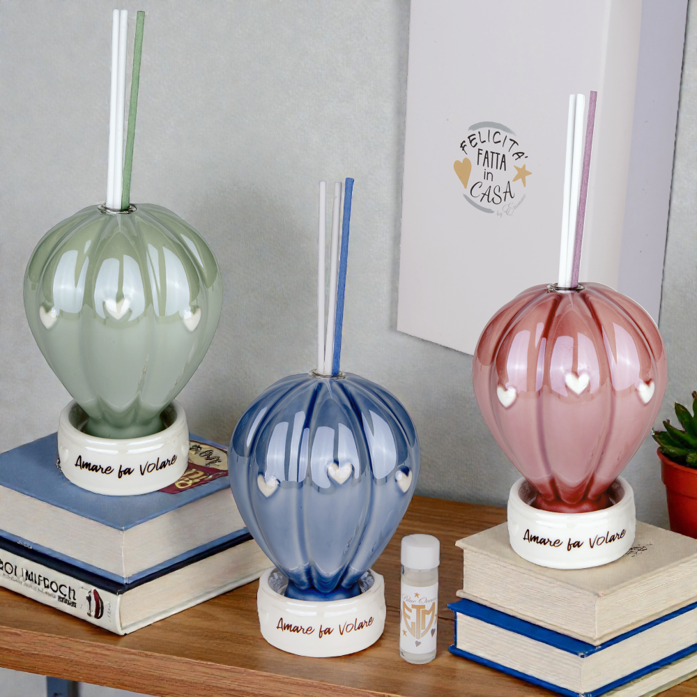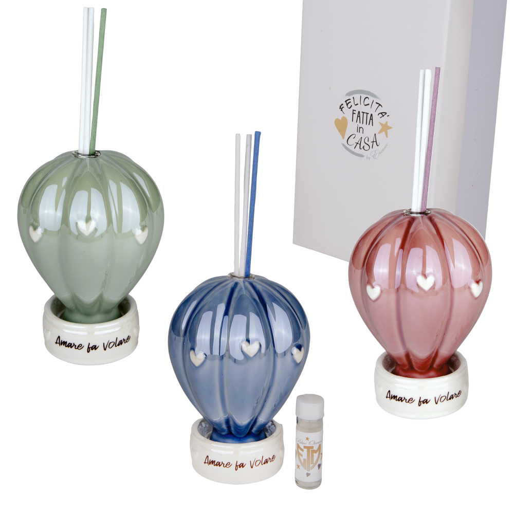 Diffusori di profumo in ceramica a forma di mongolfiera con bacchette, colori pastello e scritta “Amare fa volare”. Eleganti e ideali anche come bomboniera.