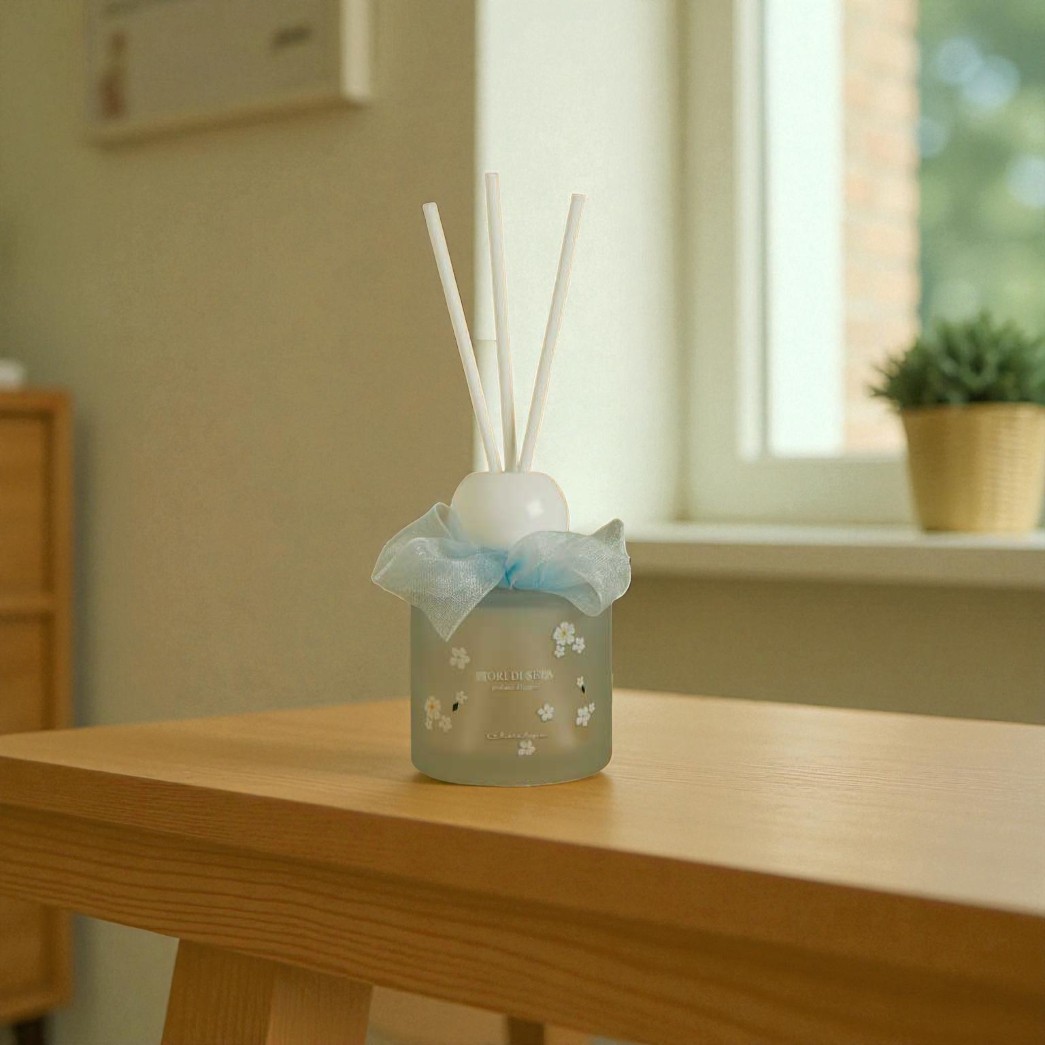 Il diffusore si distingue per la sua boccetta in vetro impreziosita da dettagli floreali bianchi e dal fiocco in organza che avvolge il tappo. Questo design raffinato e romantico lo rende un complemento d’arredo versatile, capace di adattarsi a qualsiasi ambiente e di trasmettere armonia e dolcezza.