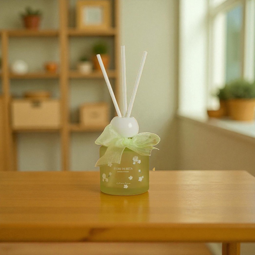 Il diffusore si distingue per la sua boccetta in vetro impreziosita da dettagli floreali bianchi e dal fiocco in organza che avvolge il tappo. Questo design raffinato e romantico lo rende un complemento d’arredo versatile, capace di adattarsi a qualsiasi ambiente e di trasmettere armonia e dolcezza.