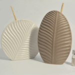 Diffusori in porcellana a forma di foglie, perfetti per chi vuole regalare ai propri ospiti una bomboniera elegante ed originale, dallo stile moderno; con kit essenza assortito in 2 colori: bianco e tortora, completo di portaconfetti in tessuto con bottone madreperlato e scatola Claraluna con decoro fiorato realizzata su misura. Dimensione: h 20,5 x 18 cm – h 21 x 14 cm