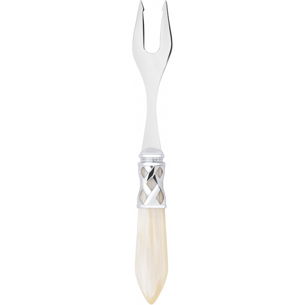 Forchettina aperitivo modello Aladdin, colorazione del manico avorio madreperla con finitura della ghiera cromata. Misure: 13 cm.