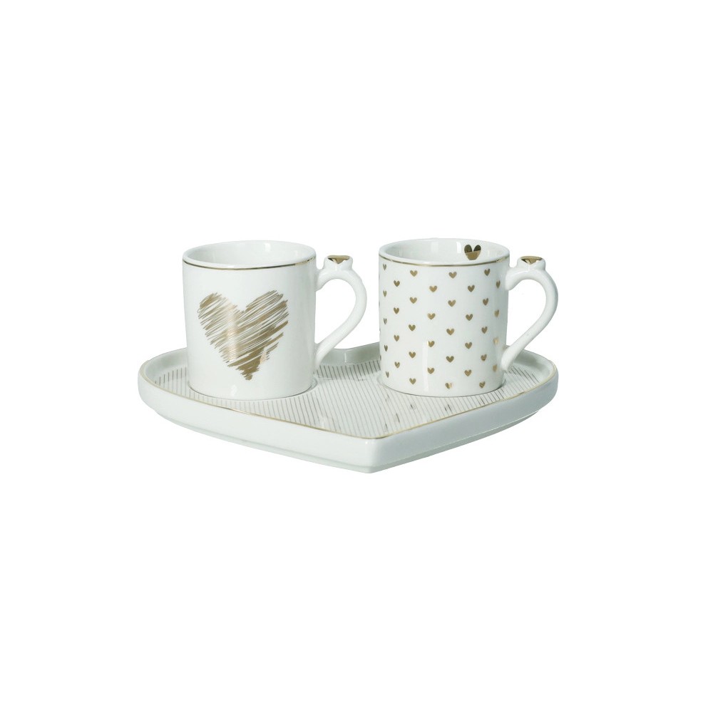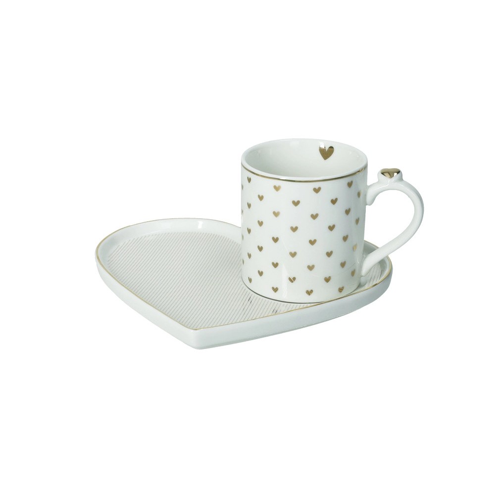 Il design elegante e romantico rende la mug con vassoio un complemento ideale per arricchire la tua tavola. La decorazione di piccoli cuori dorati e il vassoio a forma di cuore trasformano un semplice accessorio in un oggetto raffinato e speciale. Perfetta per creare un’atmosfera accogliente, questa mug con vassoio diventa un simbolo di stile e affetto.
