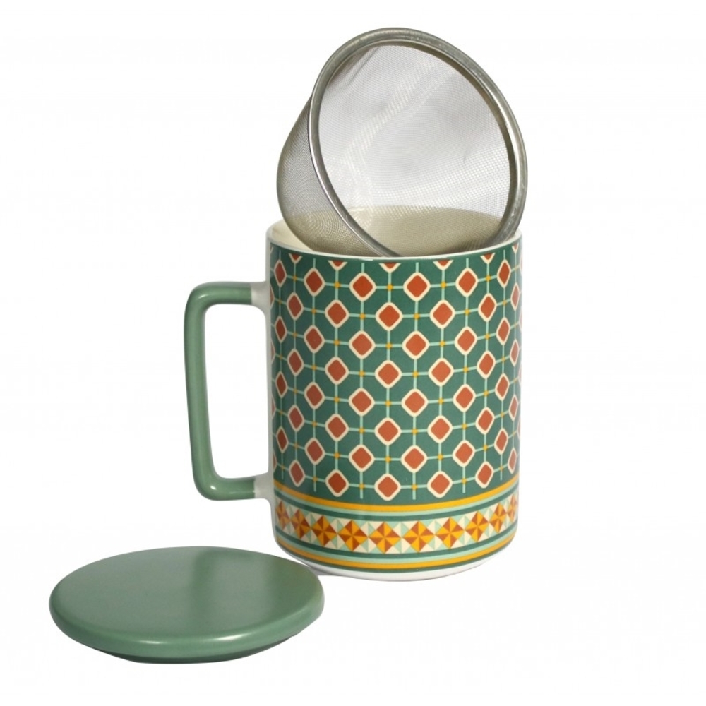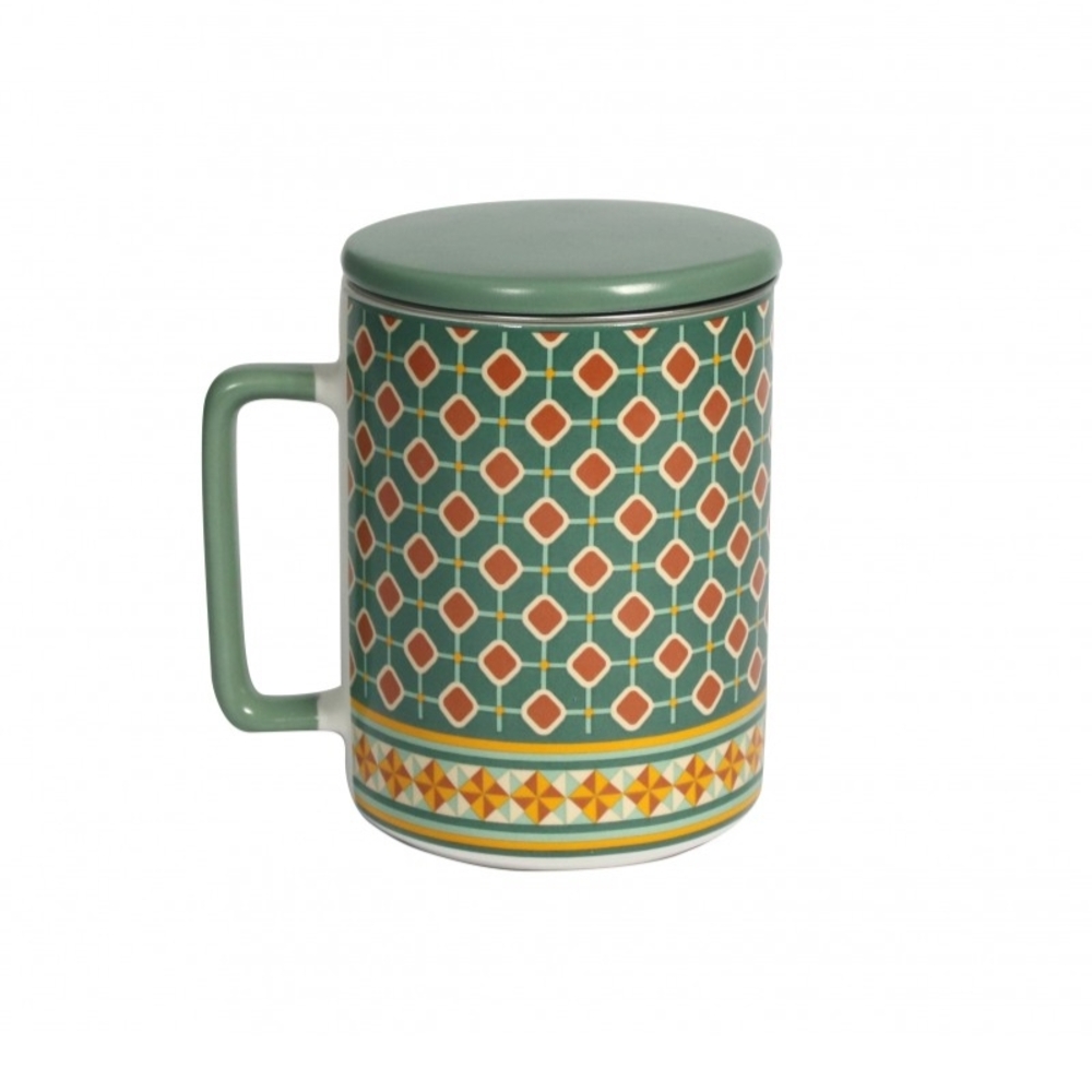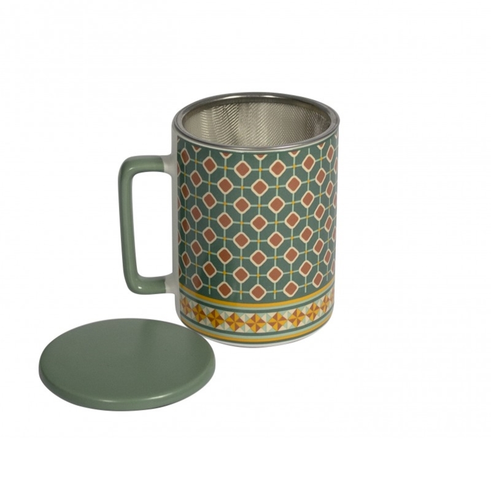 La mug realizzata in new bon chine e inox fa parte della collezione Le Cementine ed include anche tappo e filtro per un momento di relax perfetto. Questa nuova collezione 2022 si caratterizza per le decorazioni che vanno dal geometrico al floreale e ricordano le antiche lavorazioni artigianali che risplendono in molte antiche tradizioni artistiche. Dimensione: diam. 8×11,5 cm – capacità: 350 ml