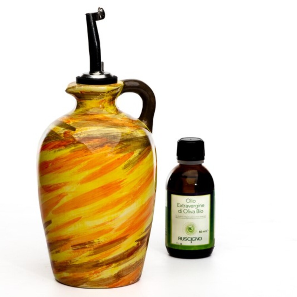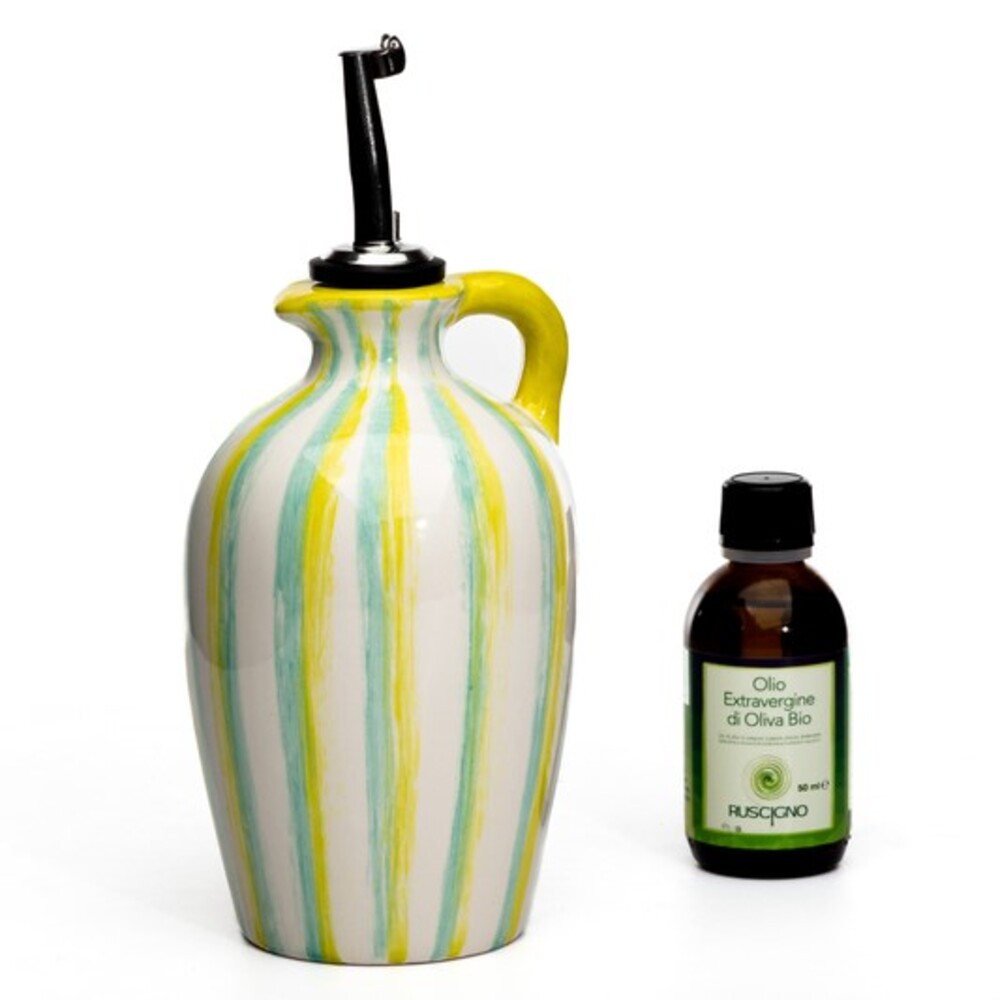 Oliera realizzata in ceramica con decorazioni colorate che la rendono adatta ad ogni ambiente e ad ogni gusto. Nella confezione è compreso un vasetto di olio bio. Dimensione: 8x8x18 cm. Guarda qui tutti gli articoli Cuorematto e scegli il tuo preferito!