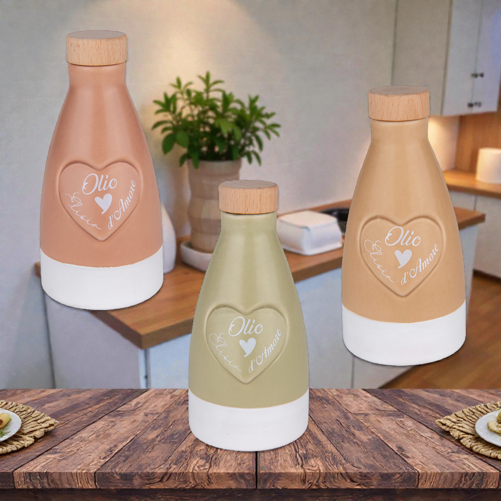 Queste oliere decorative in ceramica uniscono funzionalità ed estetica in un oggetto dal forte valore simbolico. Pensate per contenere olio extravergine d’oliva, sono impreziosite dalla scritta “Olio d’Amore” racchiusa in un delicato cuore in rilievo, che richiama sentimenti di cura, convivialità e tradizione. Perfette per completare la tavola o arricchire la cucina, queste oliere diventano anche un elegante complemento d’arredo dal gusto caldo e accogliente.