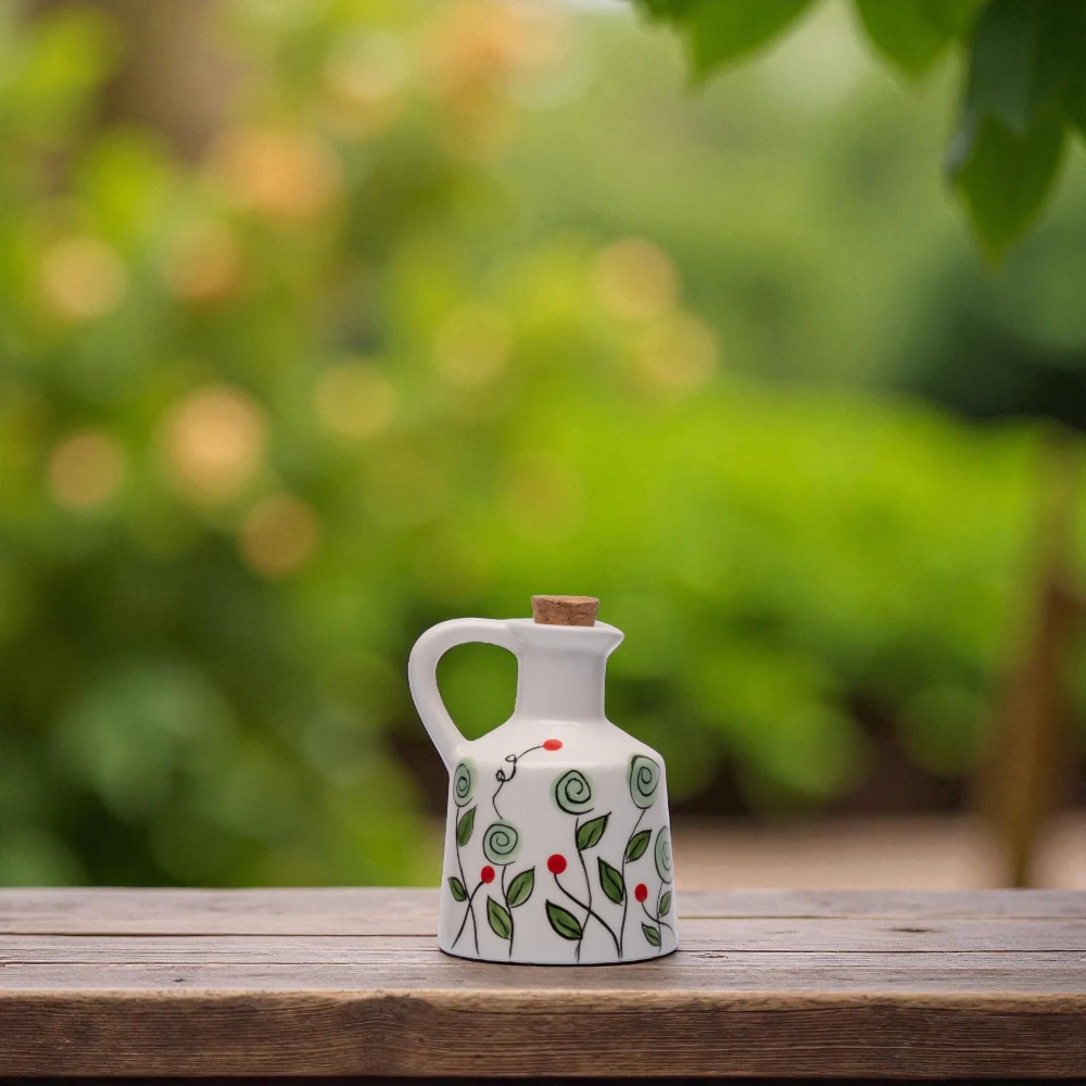 L’Oliera Piccola Bocciolo verde  di Amici di Cuorematto unisce la delicatezza estetica del design floreale alla praticità di un accessorio quotidiano. Realizzata in ceramica smaltata di alta qualità, è ideale per contenere e versare l’olio in modo preciso, evitando sprechi e gocciolamenti. Il bocciolo verde che decora la superficie aggiunge un tocco poetico e romantico, perfetto per impreziosire ogni tavola.