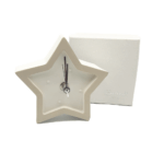 Orologio forma stella realizzato in resina bianca con bordo color panna. La stella, simbolo portafortuna, è ideale per essere scelto come bomboniera o come idea regalo. Scatola regalo inclusa. Dimensione: 11×12 cm