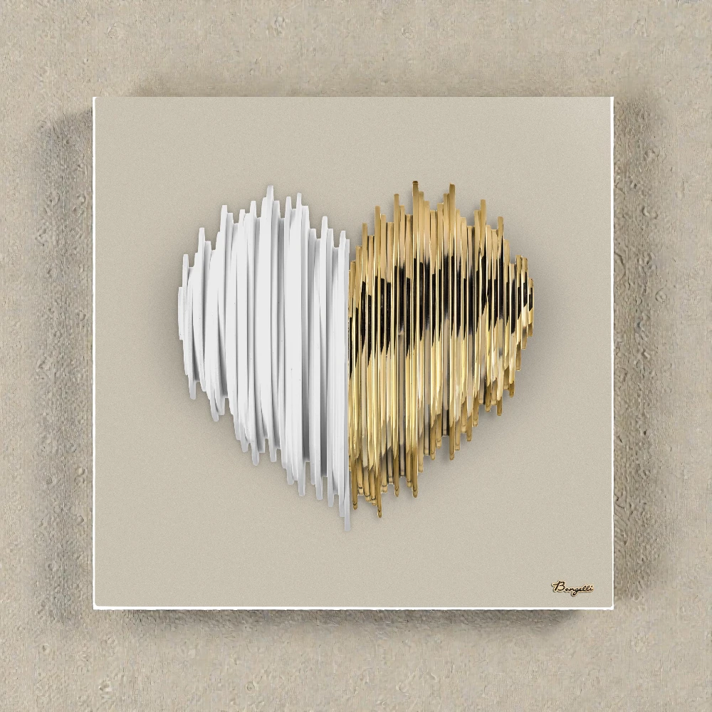 Il pannello cuore stilizzato firmato Bongelli Preziosi è un complemento decorativo raffinato che celebra l’amore attraverso un linguaggio estetico moderno ed essenziale. La forma del cuore, reinterpretata in chiave stilizzata, trasmette armonia ed equilibrio, rendendo questo oggetto perfetto per rappresentare sentimenti profondi e autentici. La combinazione cromatica oro, bianco e nocciola dona luminosità e calore, valorizzando ogni dettaglio della composizione.