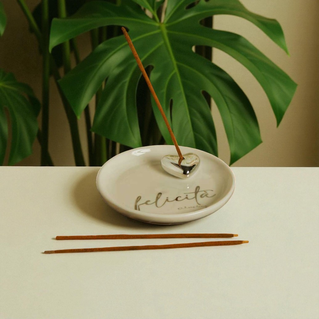 Realizzato in ceramica, il piattino porta incenso si distingue per la sua forma armoniosa e per l’applicazione di un piccolo cuore colorato, simbolo di affetto e dolcezza. La frase romantica incisa sul fronte aggiunge un tocco poetico, rendendolo perfetto per eventi dal gusto elegante e personalizzato. La confezione include 3 bastoncini di incenso, pensati per diffondere una fragranza delicata e avvolgente. Il piattino porta incenso è ideale per profumare ambienti come camere, angoli relax o spazi meditativi, trasformando la bomboniera in un oggetto utile e decorativo. Dimensione: 11,2×1 cm