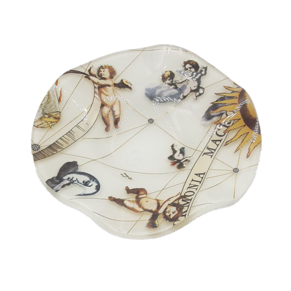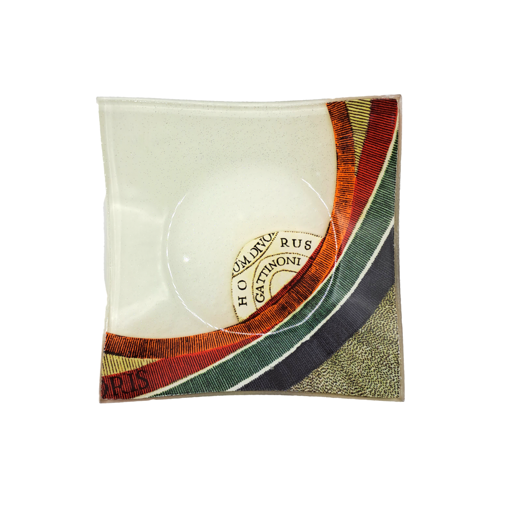 Piatto curvo in vetro con decorazioni geometriche e colori tipiche e originali Gattinoni. Qualità riconoscibile e cura nei dettagli sono le caratteristiche di questo articolo. Dimensione: 10×10 cm