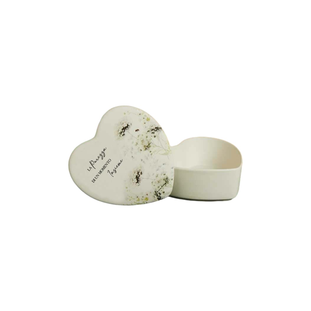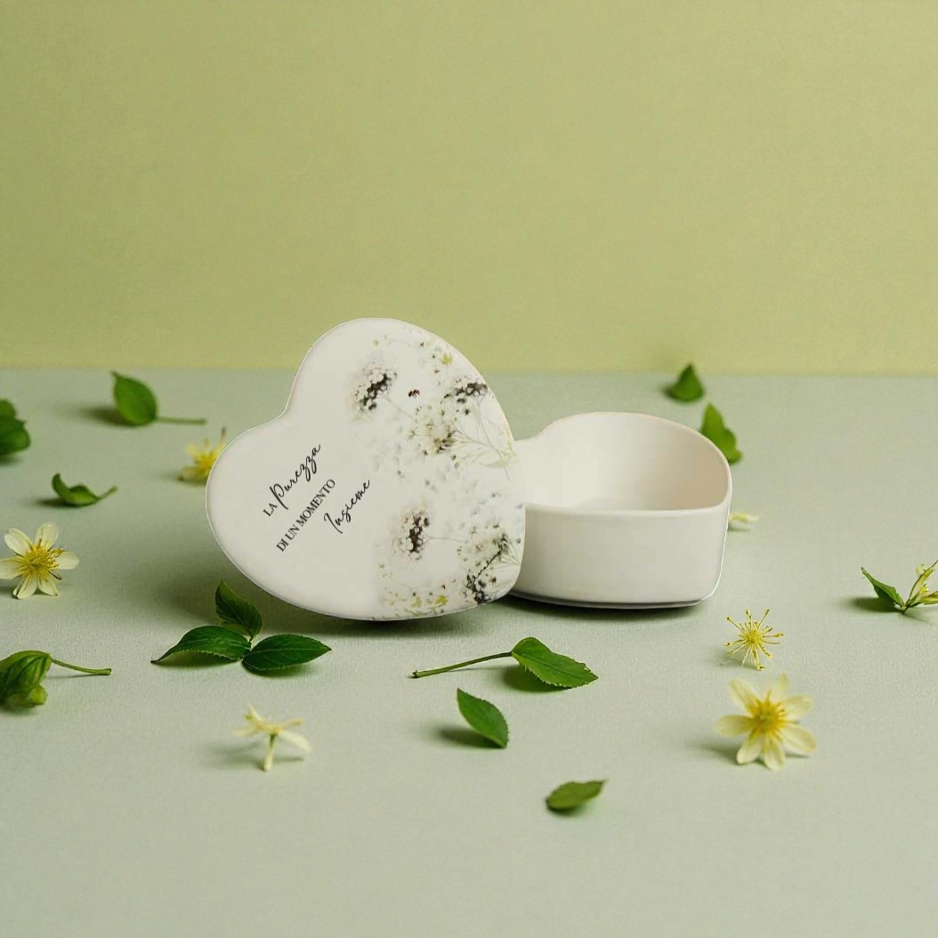 Il portagioie cuore è ideale per custodire piccoli gioielli, ricordi o messaggi speciali. Può essere utilizzato come complemento d’arredo o come contenitore personale, trasformando la bomboniera in un oggetto utile e duraturo. Ogni ospite riceverà un dono che parla di cura e attenzione.
