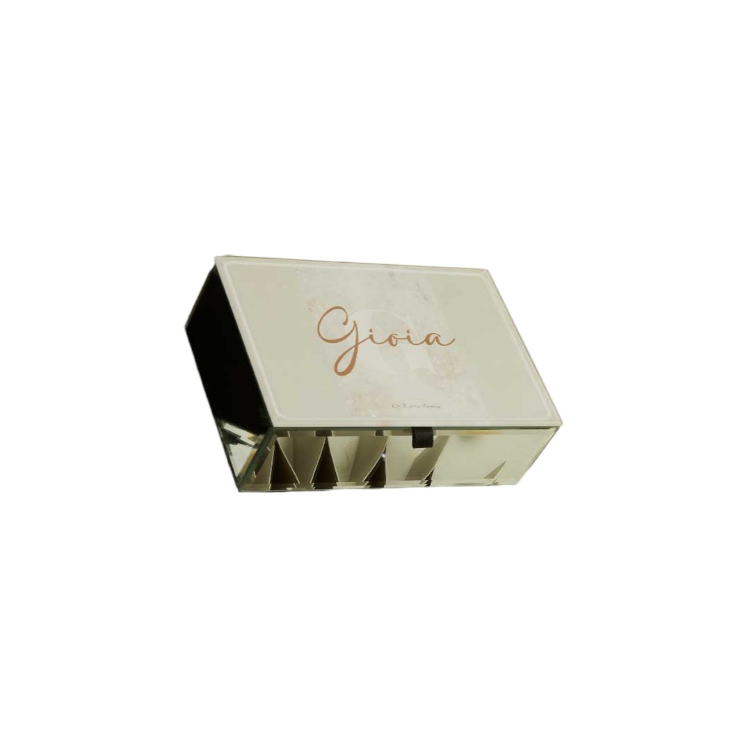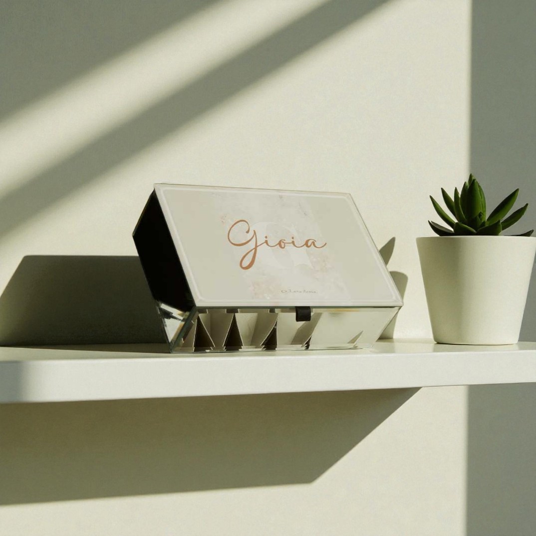 La struttura del portagioie specchio è impreziosita da un contorno specchiato che dona luce e profondità. Sul coperchio, la scritta “gioia” è accompagnata da decorazioni delicate, creando un equilibrio tra eleganza e sentimento. Il design sobrio si adatta a ogni stile di cerimonia.