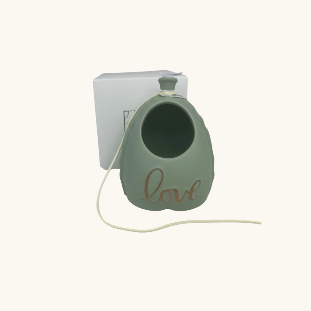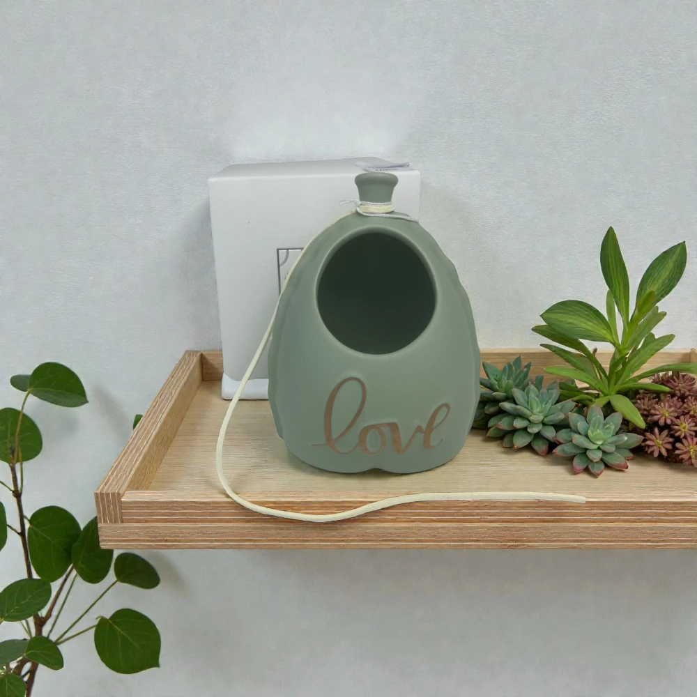La superficie del portapiantina è caratterizzata da una finitura opaca chiara, sobria e raffinata, facile da abbinare a qualsiasi palette cromatica. La scritta frontale “Love” in rilievo color oro dona un dettaglio prezioso e luminoso, creando un contrasto elegante con il fondo neutro. L’apertura superiore è ideale per ospitare piantine di piccole dimensioni, piante grasse, fiori secchi o composizioni artificiali, rendendo l’oggetto funzionale oltre che decorativo.